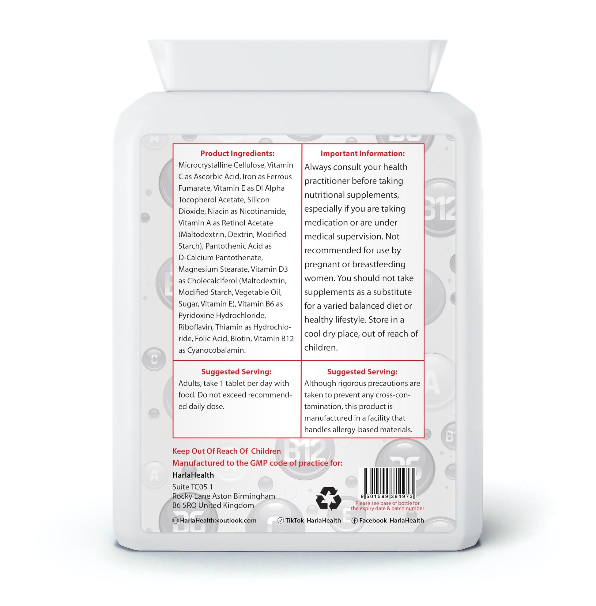 Multi-Vitamins Plus Iron - 180 Tablets - 6 Month Supply - Suitable for Vegetarians - Harla Health - Make in The UK - GMP Codes of Practice