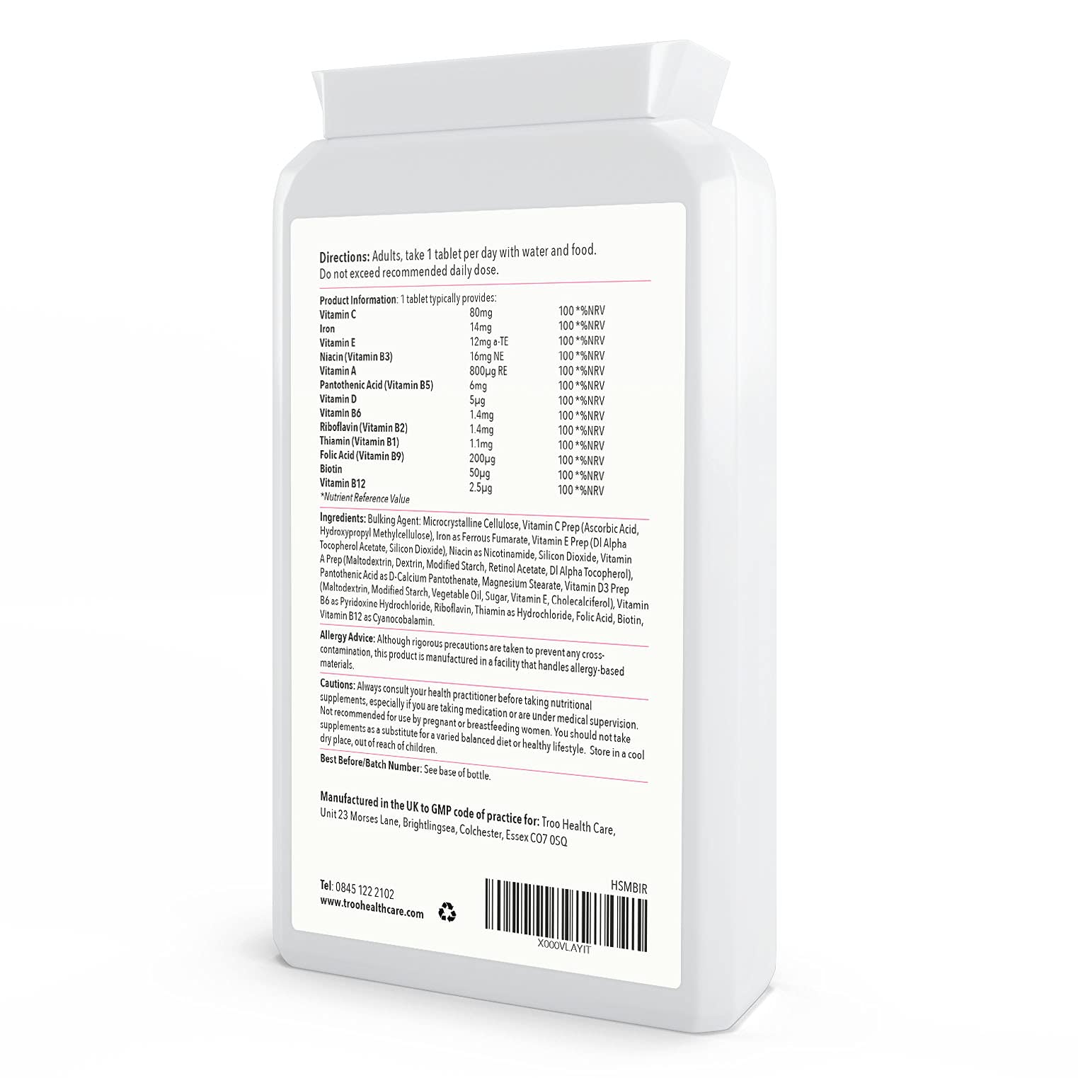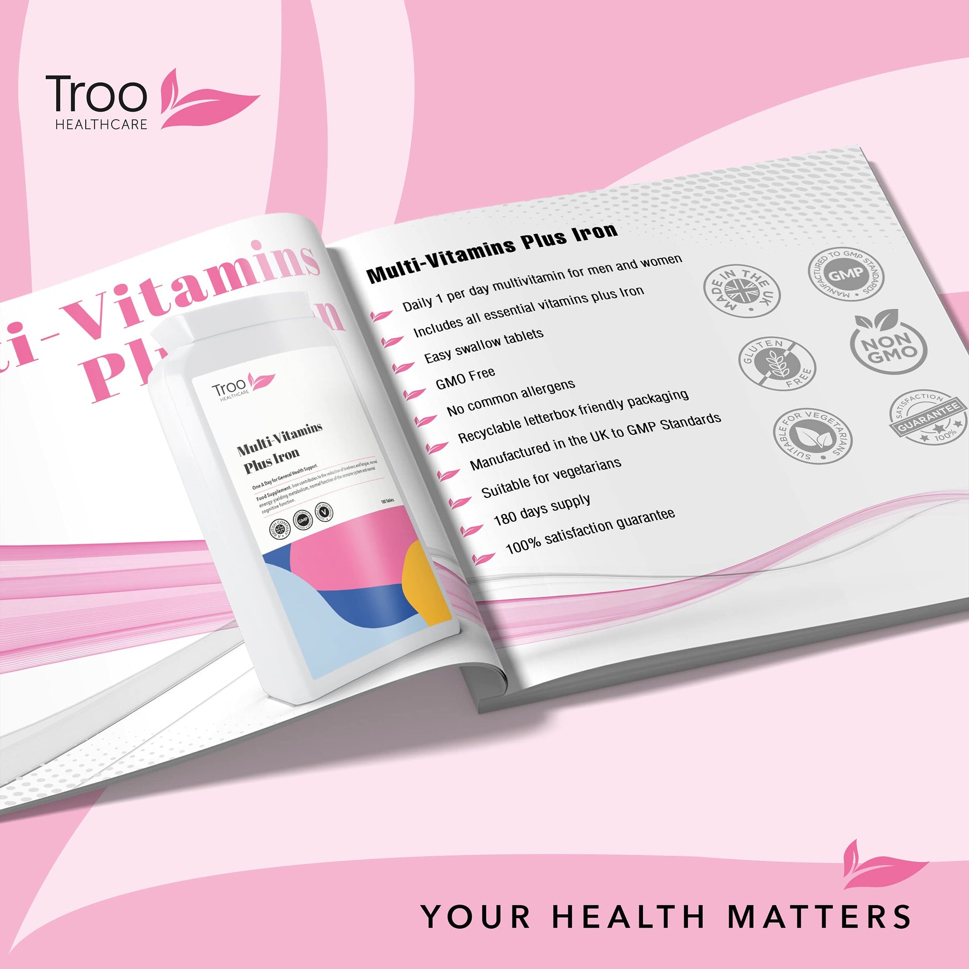 Troo Health Care Multi Vitamin and Iron Tablets are a specially formulated blend of essential vitamins and iron in a convenient daily tablet.Multi vitamins with iron supplement can be taken on a daily basis by men and women to provide health support whilst encouraging healthy hair, skin, nails, teeth and bones. A daily multi-vitamin has also been shown to support healthy energy levels.