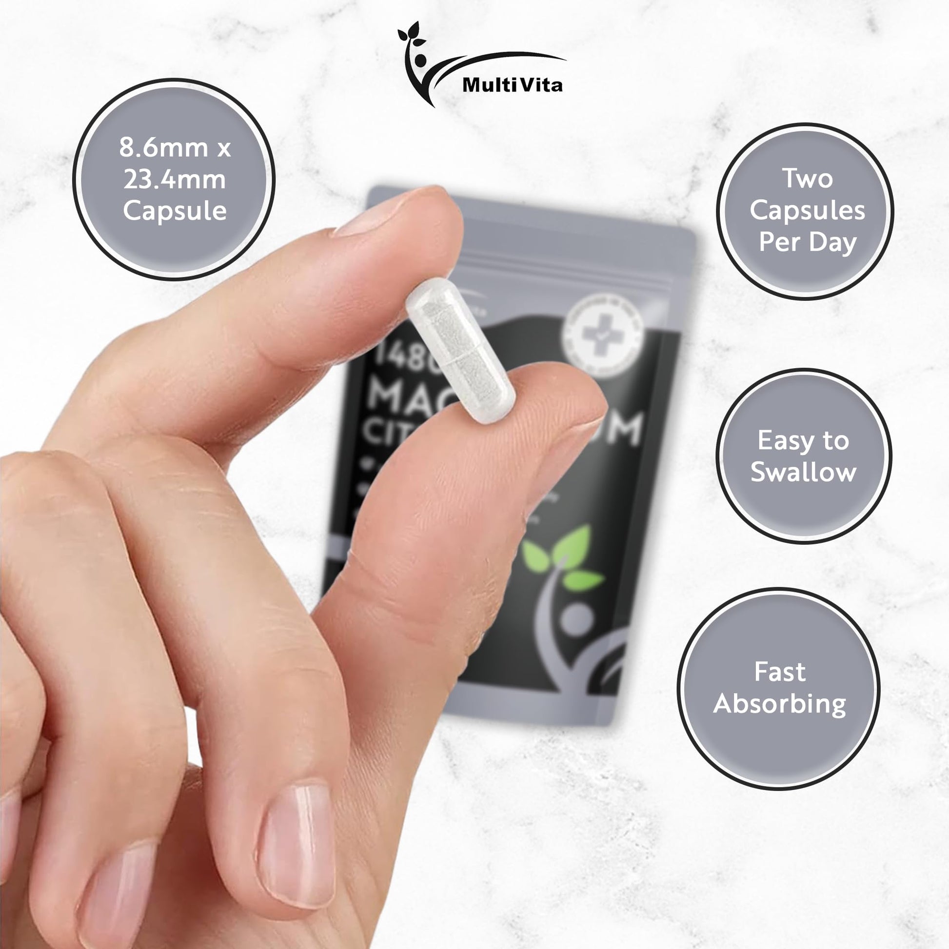 Multivita Magnesium Citrate 1,480mg 120 Vegan Capsules 2 Months Supply - Providing 440mg Elemental Magnesium Per Serving - Magnesium Capsules not Magnesium Tablets - High Strength Magnesium Supplement GMO Free