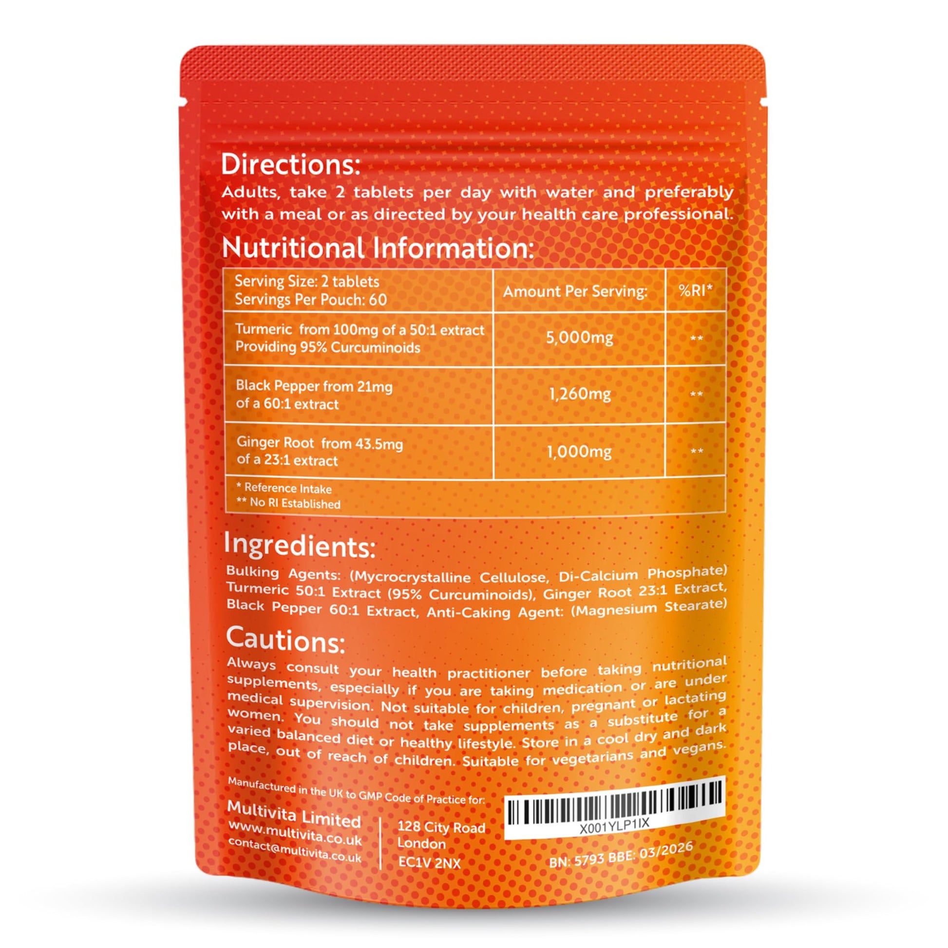 Multivita Turmeric Curcumin Tablets 7,260mg Per Serving - 95% Curcuminoids 2 Months Supply - with Ginger & Active Curcumin including Black Pepper to Aid Absorption - High Strength Tumeric Supplement - Vegan UK