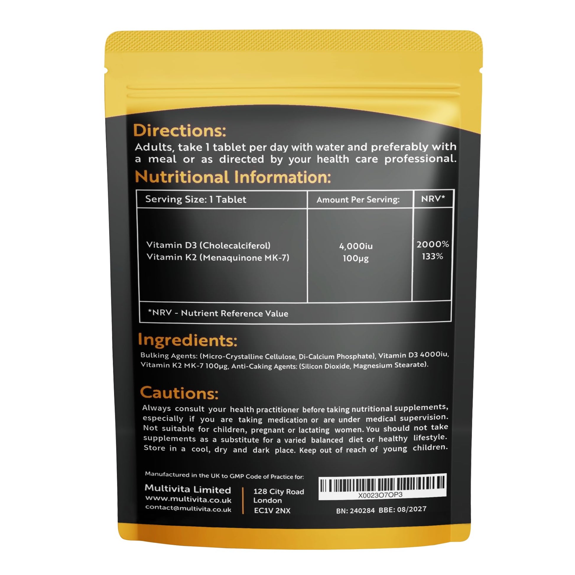Boost your vitamin D3 and K2 intake with this convenient 4-month supply of high-strength vegetarian tablets. Each tablet contains 4000iu of vitamin D3 and 100mcg of vitamin K2 (MK7), expertly formulated to support bone health, immune function, and overall well-being. These easy-to-swallow, non-GMO tablets are made in the UK to the highest quality standards, ensuring optimal potency and purity. With just one tablet per day, you can effortlessly incorporate these essential vitamins into your daily routine. Enjoy the peace of mind that comes with a reliable, high-quality supplement from a trusted brand.More Info