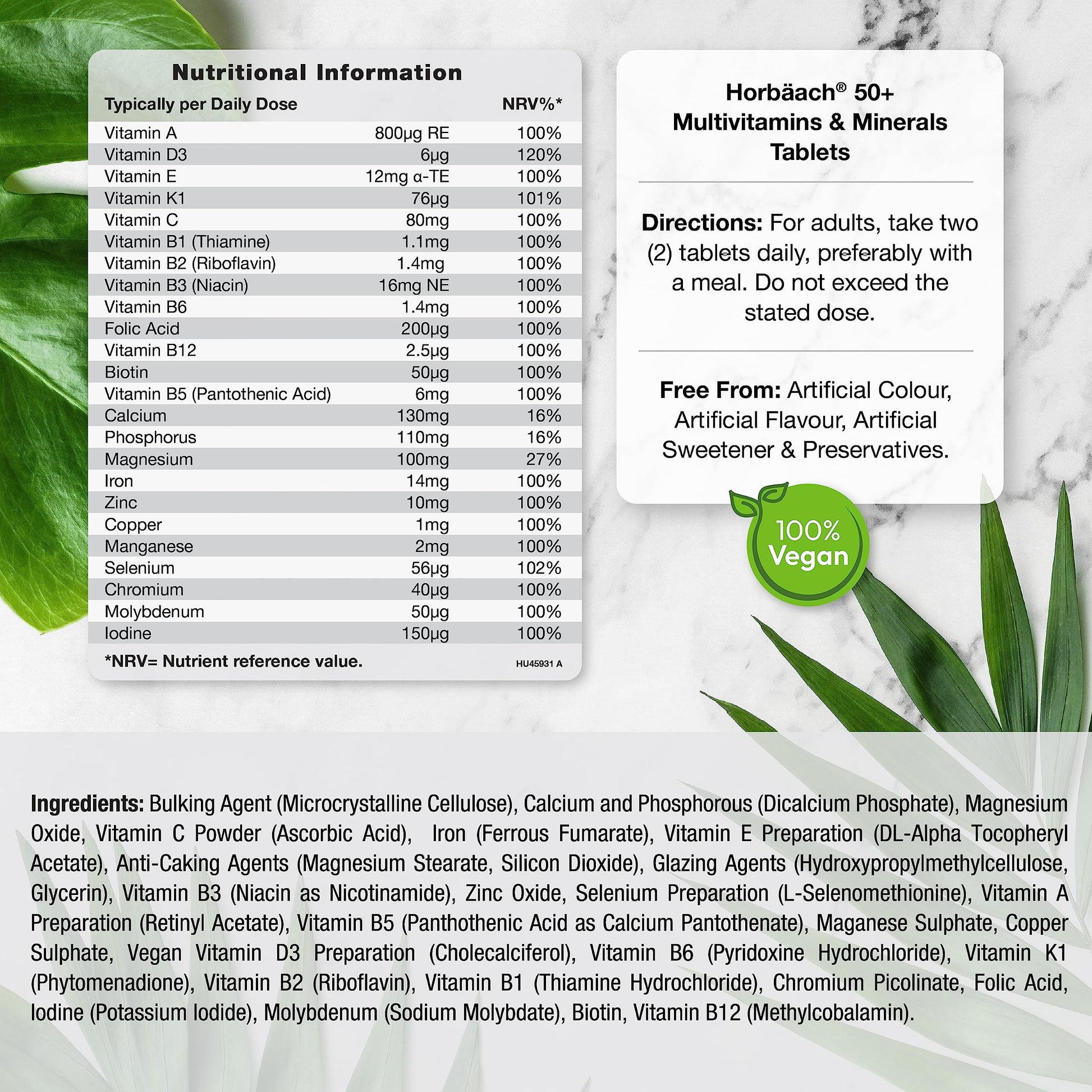 Horbaach 50 Plus Multivitamin and Mineral complex is expertly crafted for men & women who are over the age of 50. This is a common period where many men and women go through many health changes so we’ve formulated these multivitamin & mineral tablets to give your body the help you're looking for in supporting your health and living your life to the full. The main purpose of multivitamins is to fill in nutritional gaps when the nutritional requirement is not met through diet alone. They’re available in many forms, including tablets, capsules, chewable gummies, powders, and liquid drops. Why choose Horbaach 50+ Multivitamins & Minerals? It's one of the best formulas on the market, our formula contains a combination of 24 vitamins & minerals that are super easy to add to your diet. Simply take two (2) tablets daily with a drink of your choice and reap the benefits for 3+ months. Our Horbaach Multivitamin & Mineral range also includes Multivitamin gummies for adults & kids and Multivitamin tablets for Women, Adults, Teens and 70+.More Info