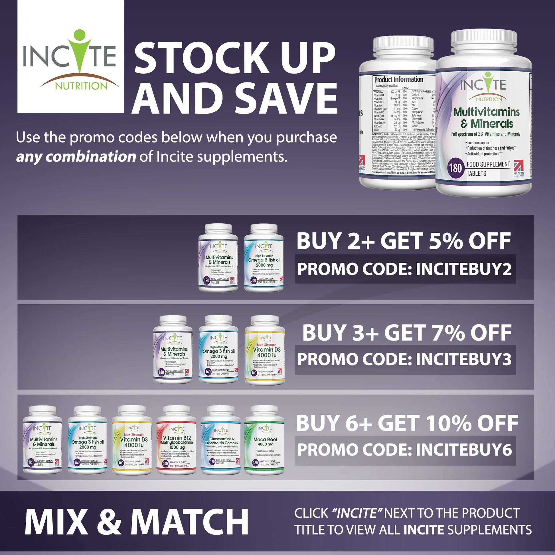 Incite Nutrition's one-a-day Multivitamin & Minerals supplement provides a full spectrum of vitamins and minerals for nutritional support . Each tablet provides 100% of the Nutrition Reference Value (NRV) for 26 Vitamins and Minerals. Suitable for Vegetarians and Vegans (contains a vegan source of vitamin D3).