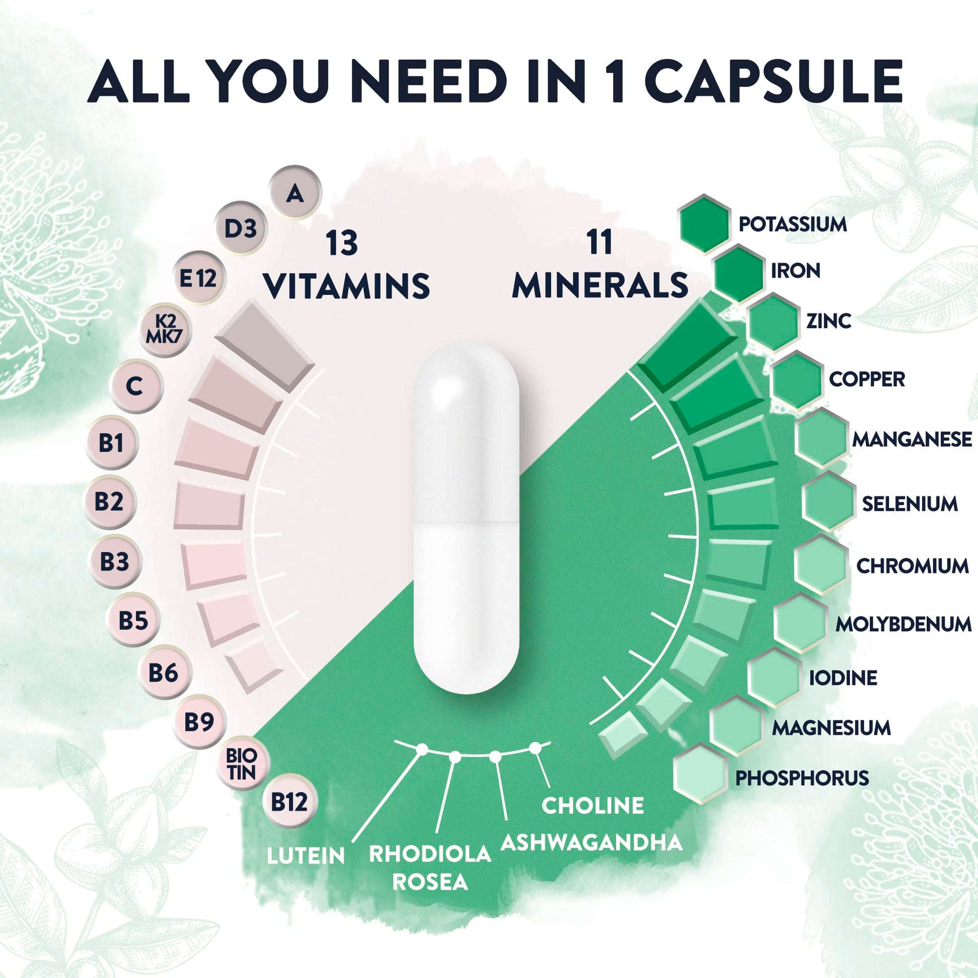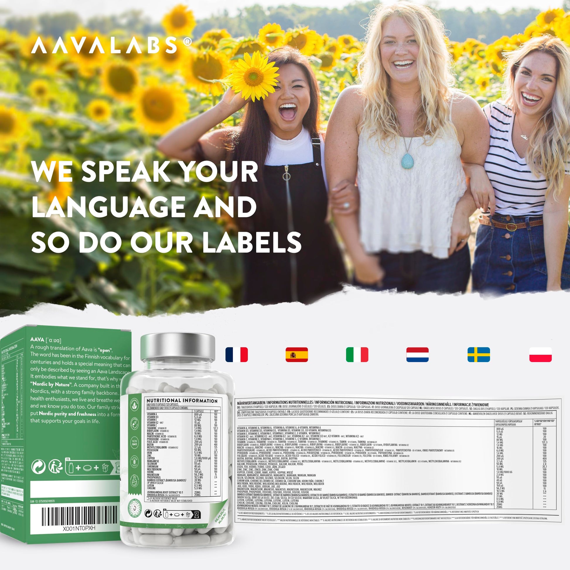 FULL SPECTRUM FORMULA: When it comes to staying fit and healthy, multivitamins and minerals play an important role. One capsule of our high-dose multivitamins formula provides you with 24 essential vitamins & 26 nutrients. To complete our formula even more, we have added natural Ashwagandha & Rhodiola Rosea. Developed by our experts to promote vitality & balance. POWERFUL INGREDIENTS: Make your well-being your priority! Our multivitamin tablets for women and men contains copper, iron, selenium, vitamin A, B12, B6, C, D & zinc help maintain normal immune system function. Biotin, magnesium, vitamin B12, B6, C etc. support normal mental function. Iodine, iron, zinc contribute to normal cognitive function. Biotin, Copper, Iron, Magnesium, Vitamin B & C contribute to the reduction of fatigue. Listening to your body and pampering it with vitamins & minerals is pure self-love. NATURAL SUPPORT: We at AAVALABS believe: the more natural, the better! Or is there anything better than promoting muscles and hair in a natural way? Support the normal muscle function with magnesium, potassium & vitamin D. Biotin, selenium & zinc help maintain normal hair, nails & skin. Stress reduction is also key to well-being. Our formula contains ashwagandha, also known as sleep berry, and rhodiola. Both have been an important part of traditional Ayurvedic medicine for thousands of years. PREMIUM QUALITY: At AAVALABS we take quality control very seriously. Tested by third parties, we guarantee the highest European quality and safety standards in a European GMP certified facility in all production phases of the multi vitamins supplements. The formula is allergen, gluten & lactose free and contains no magnesium stearate, zinc oxide & titanium dioxide. With one bottle you get 120 capsules, a 4 months supply. We recommend you to take 1 capsule a day. Your body will thank you! Nordic by nature - AAVALABS is a family company from Finland that produces pure and healthy multivitamin tablets under strictMore Info