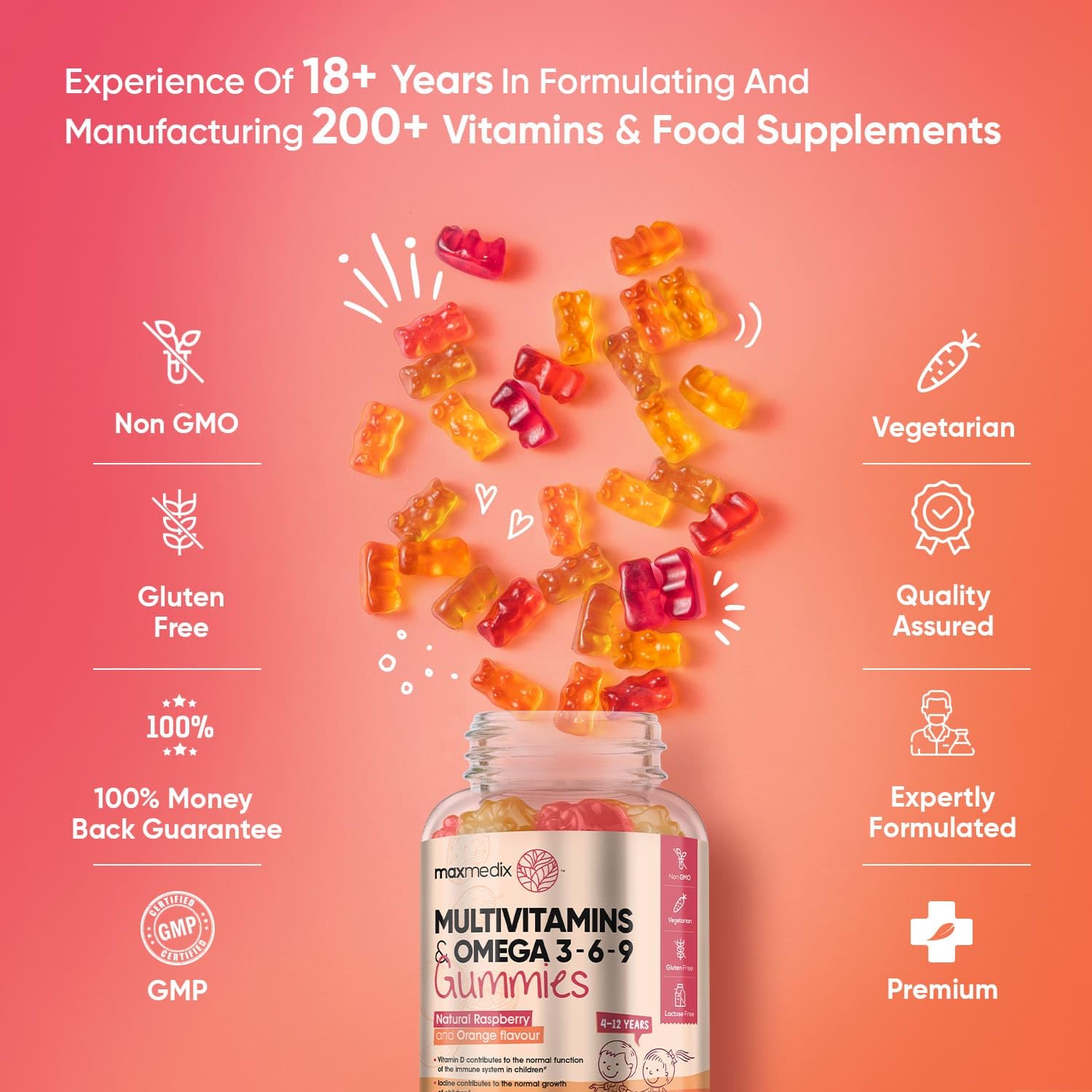 multivitamin for kids kids vitamins kids multivitamin vitamins for kids kids vitamins multivitamins kids multivitamins gummies 3-12 children vitamins multi vitamins multivitamin gummies kids gummy vitamins for kids multivitamins for kids vitamin for kids vitamin d gummies kids THE ONLY MULTIVITAMIN FOR KIDS WITH 17 ESSENTIALS INCLUDING OMEGA: Worried about your kid not getting the needed nutrition? Our kids vitamins gummies are here! Our vitamins for kids offers 17 nutrients (highest number of essentials in the market) like Vitamin A, Vitamin B1, Vitamin B2, Vitamin B3, Vitamin B6, Vitamin B9, Vitamin B12, Vitamin B7, Vitamin B5, Vitamin C. Vitamin D3, Vitamin E, Choline, Inositol, Zinc & Iodine & flaxseed oil offering omega 3, omega 6 & omega 9. DELICIOUS NATURAL RASPBERRY & ORANGE FLAVOUR - LOW SUGAR GUMMIES: Our Kids multivitamin gummies has delicious natural raspberry & orange flavour & the best part is that these omega 3 kids gummies are non sticky & has very low sugar content (unlike, other competitors we do not hide the sugar content). Each bottle offers you 120 children vitamins gummies, a supply of complete 2 months. Build a right foundation for a healthy tomorrow with our multivitamin gummies kids. VEGETARIAN FREINDLY MULTIVITAMIN KIDS GUMMIES MADE WITH EXTRA LOVE & CARE: Our gummy vitamins for kids are gluten free, lactose free & gelatine free. Our kids multivitamins gummies are vegetarian friendly. These childrens vitamins gummies are a great alternative to multi vitamins kids tablets or capsules. We understand how delicate a growing kid's health & the importance of getting the right nutrition, that is why we have mindfully crafted these gummies with premium ingredients.More Info