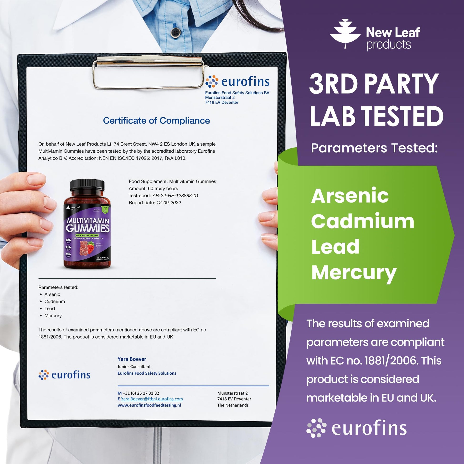 - THIRD PARTY LAB TESTED - Each ingredient is quality tested before our manufacturing process begins, once completed every batch of our vitamin gummies undergoes further rigorous quality testing. Our multivitamin gummies have been 3rd party tested for heavy metals and unwanted compounds by UK & Europe's largest testing facilities (Eurofins) The lab is UKAS accredited according to ISO/IEC 17025:2017