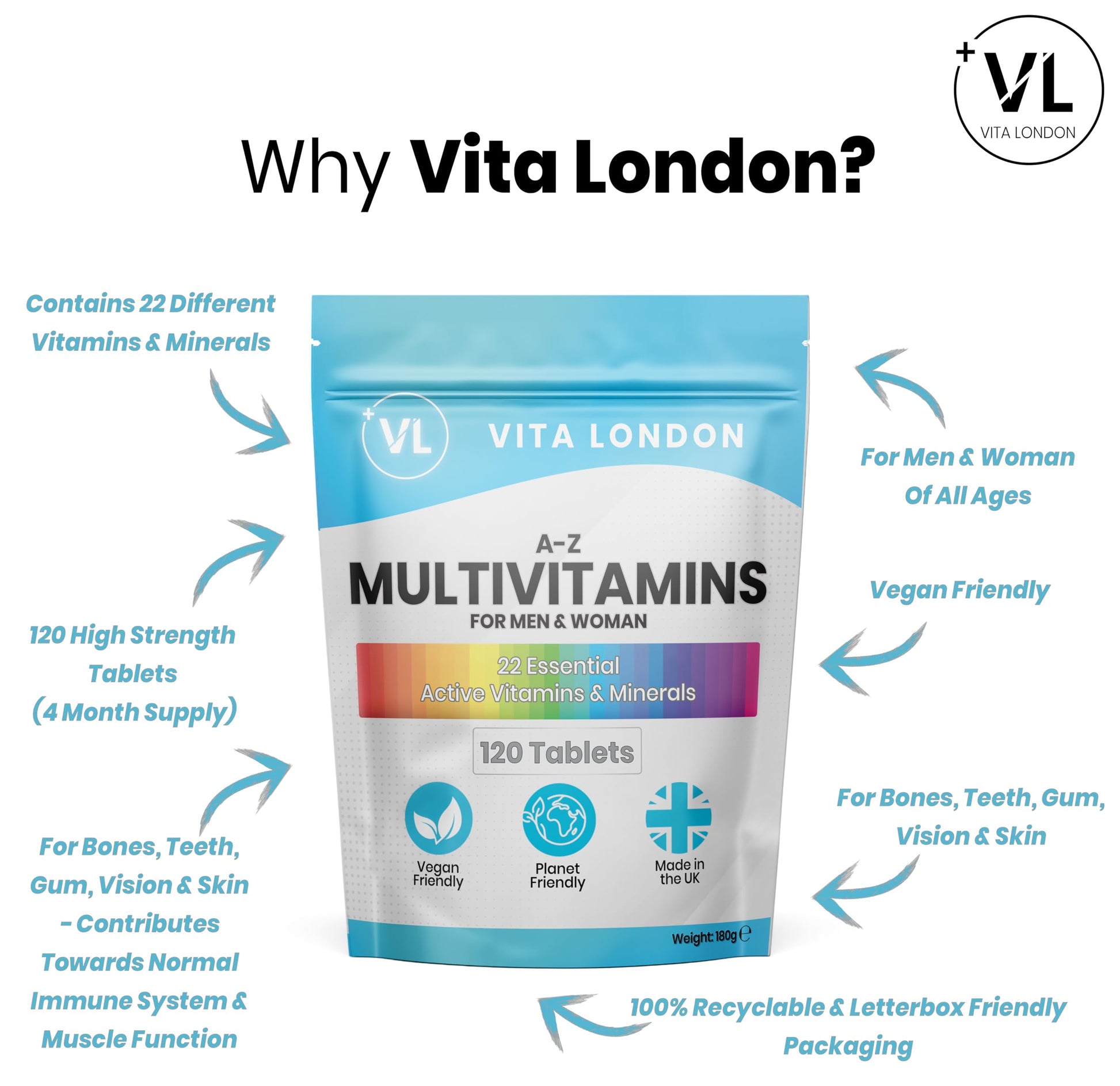 Vita London Vitamins & Supplements. High Quality products researched, tested and produced in the UK. Support UK industry.22 Essential Active Vitamins including Iron, Zinc, Magnesium, Vitamin A, B, C, D, E, K Calcium, Folic Acid, Selenium, Copper and more! Suitable for Men & Women.