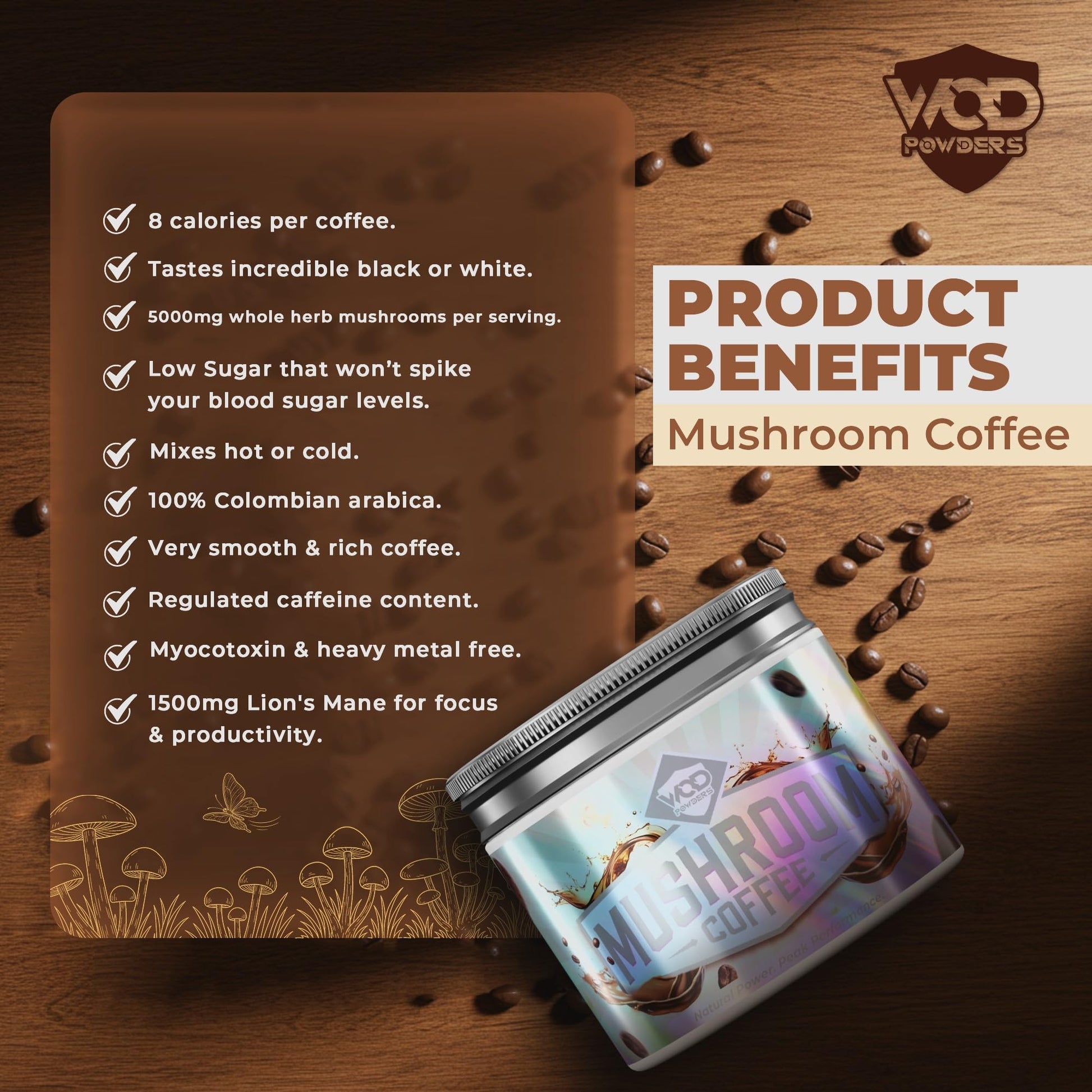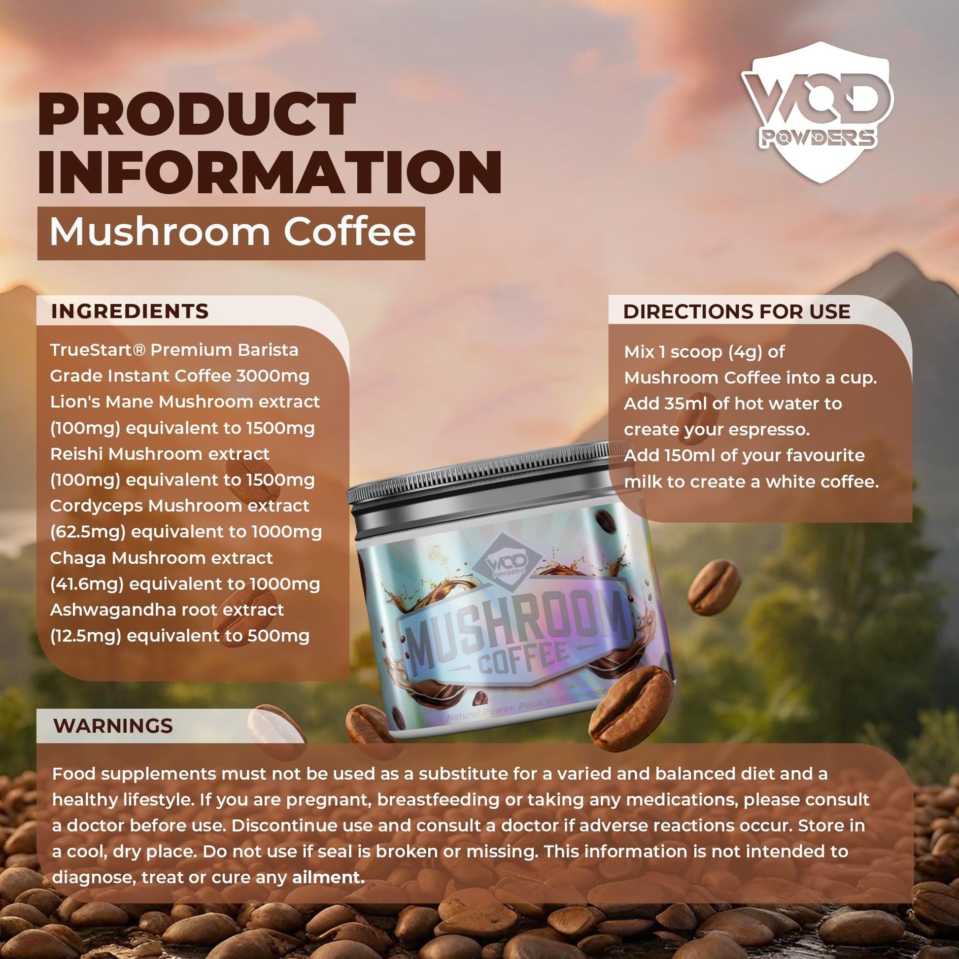 Upgrade your coffee routine with WOD Powders Mushroom Coffee, the smarter alternative to your standard cup of coffee. Our blend has been designed for long lasting energy, focus, improved mood, and reduced stress. This unique blend combines the delicious taste of coffee with 4 functional mushrooms & ashwagandha.