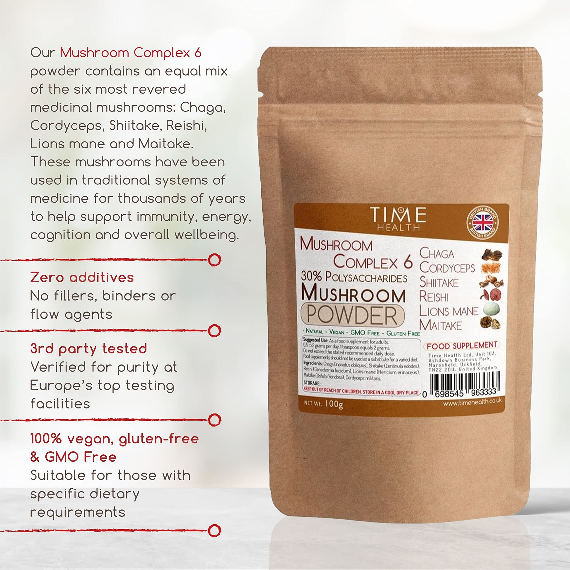 Mushroom Complex 6 Powder ∣ Chaga, Cordyceps, Shiitake, Reishi, Lions Mane, Maitake ∣ 30% Polysaccharides (100g Powder Pouch)