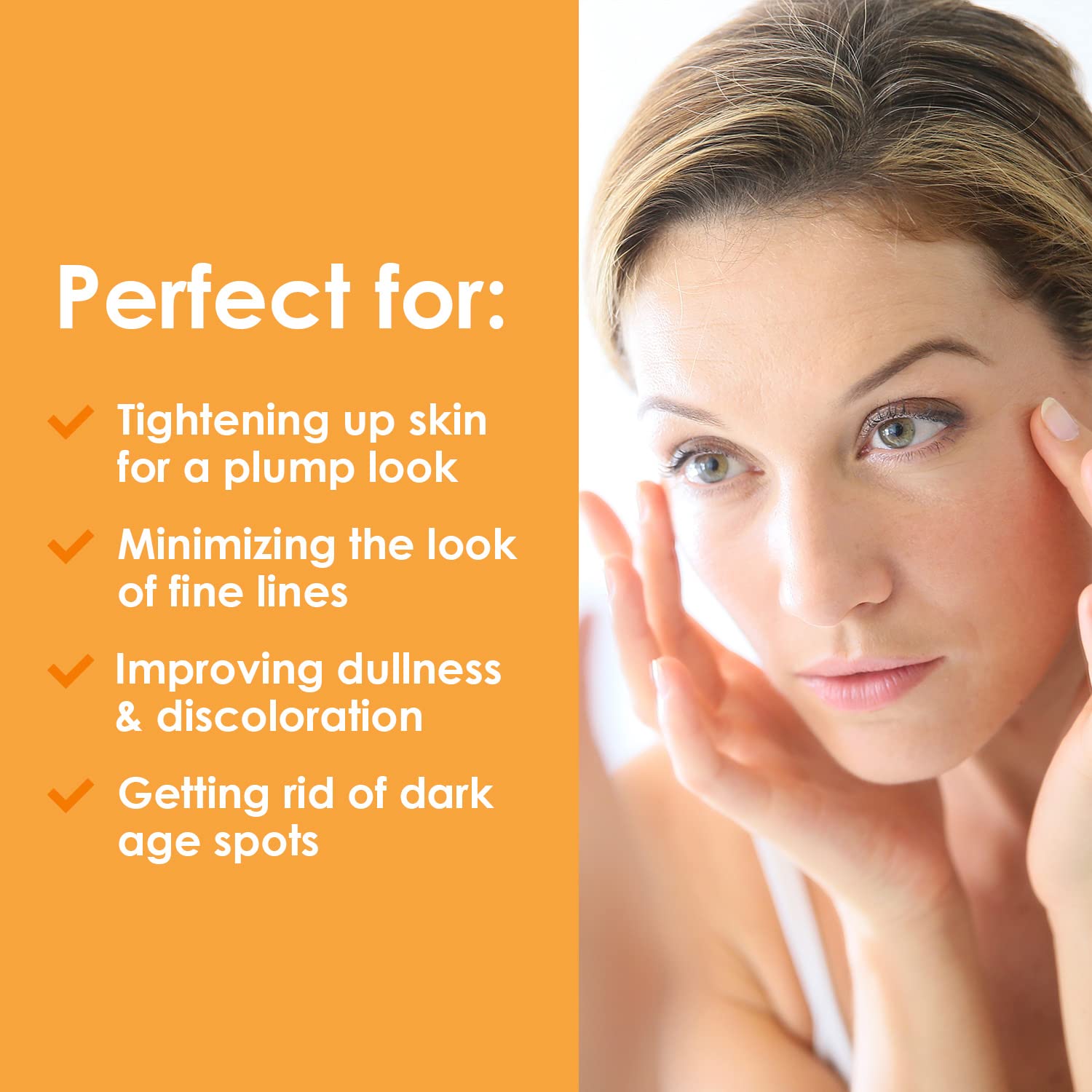 Our Vitamin C Serum tightens, brightens and makes skin feel smoother. It uses one of the most stable vitamin c derivatives and other high-quality ingredients! It works to improve collagen building, fade age spots and discoloration. Some Vitamin C Serum benefits include skin tightening, skin bleaching and more! It is for both men & women. For the best results, it’s best to use it daily. PROFESSIONAL FORMULA: Uses one of the most stable Vitamin C derivatives (Sodium Ascorbyl Phosphate) & other high-quality ingredients to improve collagen building, reduce fade age spots & improve discoloration. Vitamin C Serum works great with sensitive skin, it absorbs quickly and does not leave oily or greasy marks. This product is for both men & women! Use daily and experience results in weeks. SOME KEY FEATURES: The Vitamin C Serum contains the maximum Vitamin C derivative allowed on the market. This formula enables skin cells to band together, promoting healthier and more youthful-looking skin. Vitamin C is a natural antioxidant that reduces free radicals from forming and damaging skin - thus helping with acne control and small pores. By clearing the skin, you are negating wrinkles and fine lines from looking more pronounced. Vitamin C also helps to inhibit the enzyme tyrosinase, which helps to prevent melanin production. MAX VITAMIN C CONCENTRATION: Our Vitamin C Serum contains the maximum concentration of Vitamin C allowed. With such a high potency, collagen production is rapidly enhanced. Collagen is a structural protein that holds cells together, strengthens skin, and gives it elasticity - all of which are important for a healthy, toned complexion. By boosting our skin's ability to make collagen, a Vitamin C serum helps soften existing fine lines and wrinkles, while also preventing new ones from forming.More Info