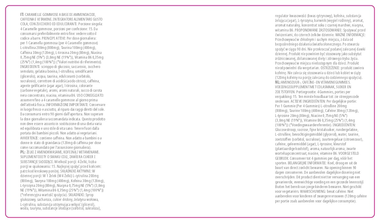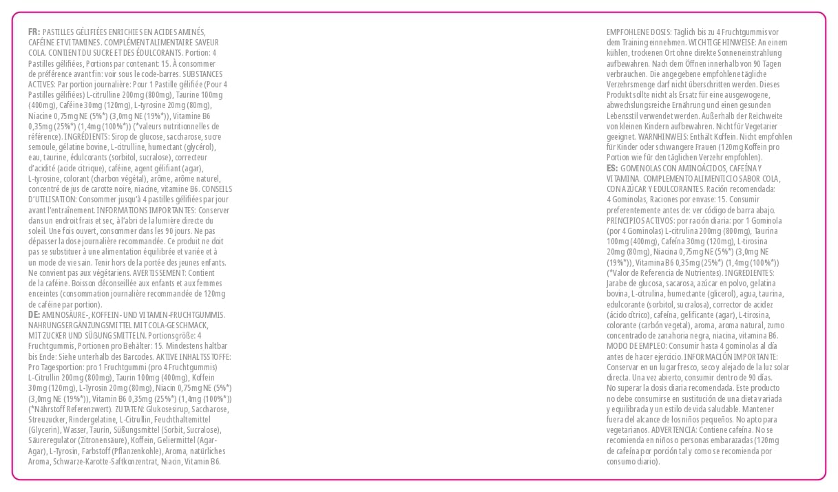 Unleash your full potential with Myprotein Pre-Workout Gummies—a cutting-edge, chewable alternative to traditional pre-workout powders and drinks. Designed for those who want quick energy, enhanced endurance, and laser-sharp focus, these gummies are packed with performance-boosting ingredients to help you crush every workout. Each serving delivers a precise dose of caffeine, L-citrulline, and taurine, known for their ability to increase blood flow, enhance endurance, and provide sustained energy. Additionally, B vitamins (niacin and B6) play a crucial role in reducing fatigue and supporting energy metabolism, ensuring that you feel fully charged from the first rep to the last sprint. Forget about carrying messy powders or waiting for your pre-workout drink to kick in. These cola-flavoured gummies provide a fast, effective, and delicious energy boost that absorbs quickly, getting you gym-ready in minutes. With no artificial colours and naturally sourced ingredients, they deliver a great-tasting, convenient solution for athletes, runners, and fitness enthusiasts who demand more from their workouts. Please Note: This product contains sugar (glucose syrup, sucrose, and caster sugar) as part of its formulation, along with sweeteners, to enhance flavour and provide an optimal energy release. Take your training to the next level with Myprotein Pre-Workout Gummies – the ultimate on-the-go performance enhancer! Glucose Syrup, Sucrose, Caster Sugar, Beef Gelatine, L-Citrulline, Humectant (Glycerol), Water, Taurine, Sweeteners (Sorbitol, Sucralose), Acidity Regulator (Citric Acid), Caffeine, Gelling Agent (Agar), L-Tyrosine, Colour (Vegetable Carbon), Flavouring, Natural Flavouring, Black Carrot Juice Concentrate, Niacin, Vitamin B6.More Info