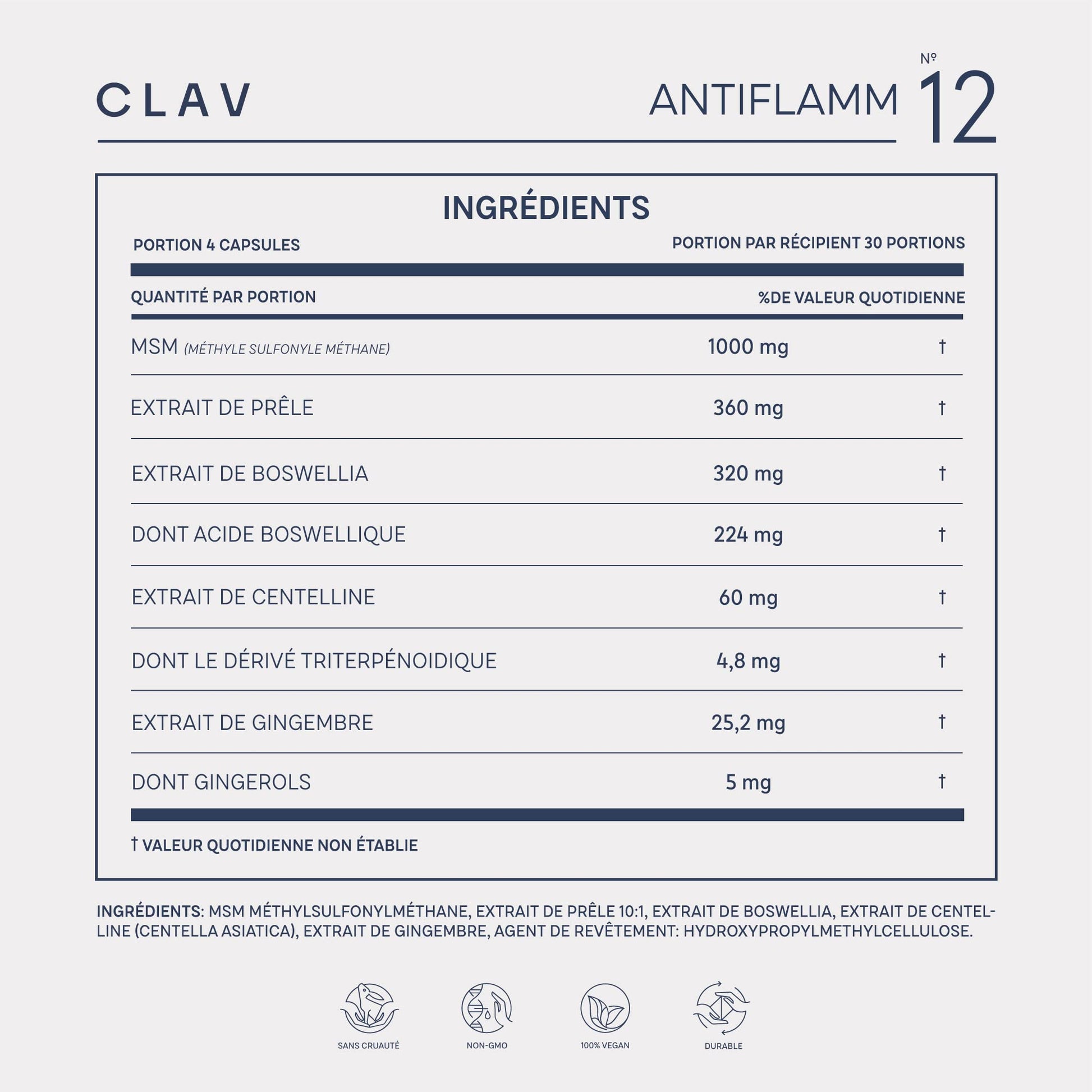 MSM means methylsulfonylmethane which is an organic source of sulphur for the body. For example sulphur is needed in the joints to build chondroitin sulphate which is important for the resistance of the cartilage. Field horsetail is an herb that has been used in healing for many centuries and has many great properties. We have chosen a highly pure 10:1 extract of field horsetail. N°12 Antiflamm also contains the best frankincense extract (Boswellia Serrata) with 70% boswellic acid. This valuable resin also has a long history of use.