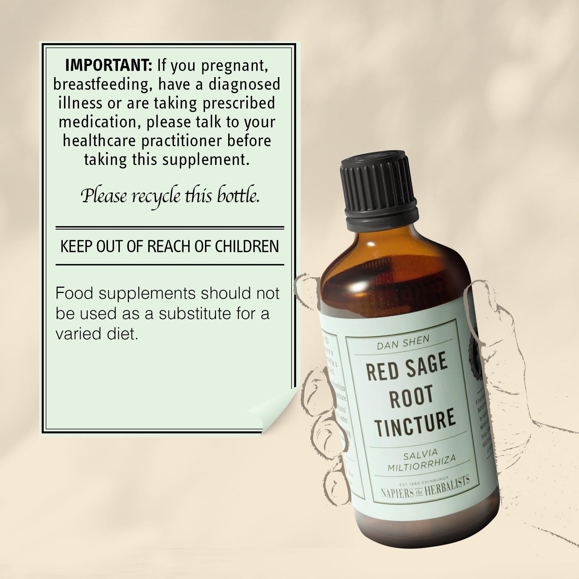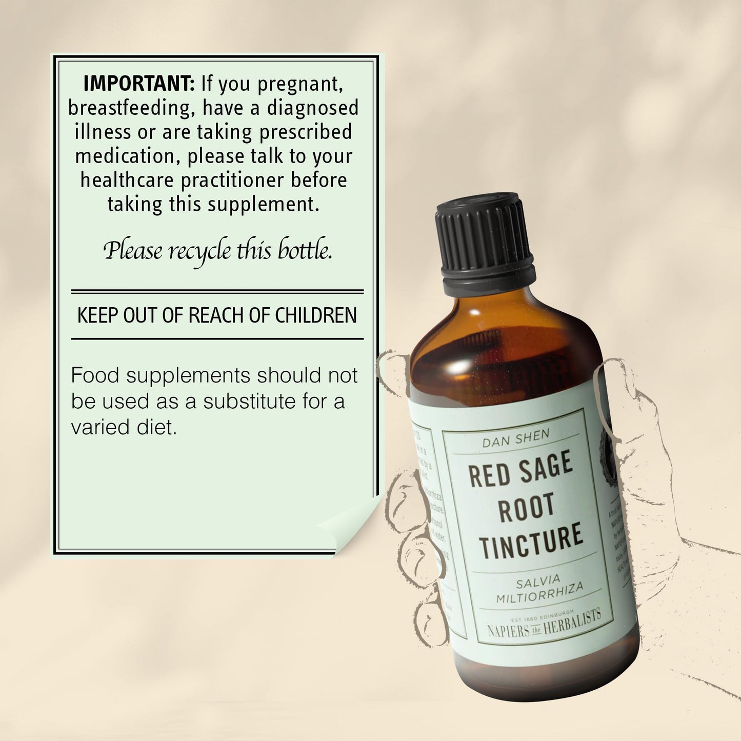 Experience the potency of nature with Napiers Red Sage Tincture, a high-quality herbal supplement designed to support your health. Formulated with Salvia miltiorrhiza, also known as Red Sage or Dan Shen, this tincture is an easy-to-use alternative to herbal teas. Just add up to 1 ml (20 drops) to a little water, three times a day, and experience its numerous benefits. As a trusted brand, Napiers the Herbalists has been providing high-quality herbal remedies and supplements since 1860. Our commitment to excellence and our legacy of Duncan Napier, an eminent Victorian botanist and the most famous herbalist in Scotland, ensures that our herbal tinctures, natural therapeutic skincare, botanical beauty, and herbal food supplements are second to none. Remember to consult with a medical herbalist or healthcare practitioner if you're pregnant, breastfeeding, young, unwell, or on medication. This product is not intended for use by a person under the age of 18. Avoid taking with blood thinning medications and be aware that the effect may be lessened by milk and soy products. Napiers Red Sage Tincture, a natural choice for herbal supplementation.More Info