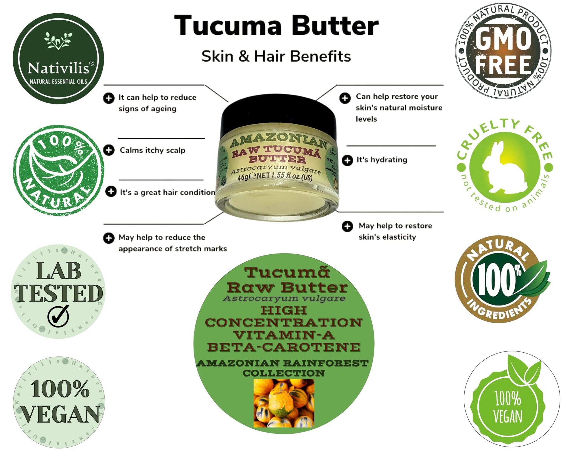 Nativilis Natural Essential Oils Nativilis Amazonian Raw TUCUMA BUTTER (Astrocaryum vulgare) – GREAT HAIR CONDITIONER - HIGH CONCENTRATION VITAMIN-A BETA-CAROTENE - SKIN and Hair Care - nourishing, moisturizing, antioxidant - Copaiba