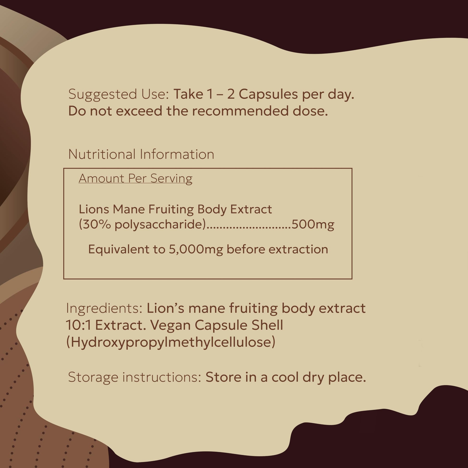 Unlock the Power of Nature with Natral Lion's Mane Capsules Experience mental clarity and cognitive enhancement with Natral's premium Lion's Mane Mushroom Capsules. Our carefully extracted, high-potency formula is designed to support memory, focus, and brain health. Product Features: 100% Fruiting Body Extract: Sourced from the purest fruiting bodies, our Lion's Mane extract provides a potent dose of beneficial polysaccharides, ensuring you receive the full spectrum of nutrients this incredible mushroom has to offer. Rich in Polysaccharides: Each capsule is packed with a minimum of 30% polysaccharides, the active compounds known for their supportive role in brain health and immune function. Vegan-Friendly: Our capsules are encased in vegan-friendly shells, making them suitable for all dietary preferences. Purity and Potency: Non-GMO, gluten-free, and free from artificial additives; Natral's Lion's Mane capsules are as pure as nature intended. Cognitive and Immune Support: Harness the natural power of Lion's Mane mushrooms, renowned for their ability to promote neural growth and protect against cognitive decline. With regular use, our capsules are your ally for a sharper mind and a robust immune system. Easy to Integrate: Incorporate into your daily routine with just two capsules a day to fuel your brain and nourish your body. Quality You Can Trust: At Natral, we're committed to the highest standards of product quality and customer satisfaction. Our Lion's Mane capsules are meticulously tested for purity and potency, ensuring you get nothing but the best in every bottle. Elevate your wellness journey with Natral Lion's Mane Capsules – Nature's gift for a clear mind and vibrant health.More Info