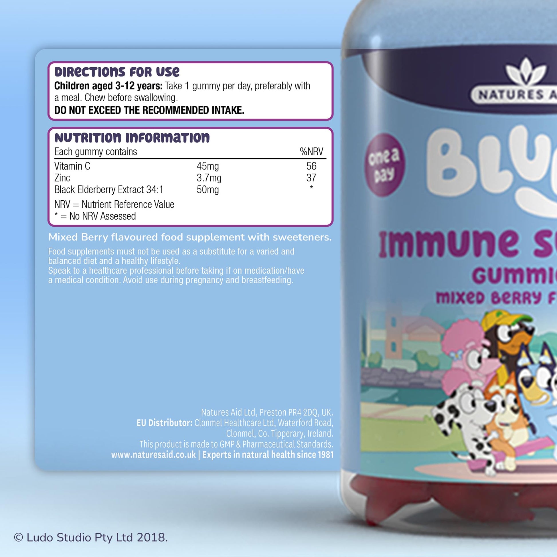 Natures Aid Bluey Kids Immune Support Gummies - Vitamin C, Zinc and Elderberry to Support Immunity and Immune System - Mixed Berry, No Added Sugar, Vegan, Gluten Free - 30 Gummys for Children Ages 3-12