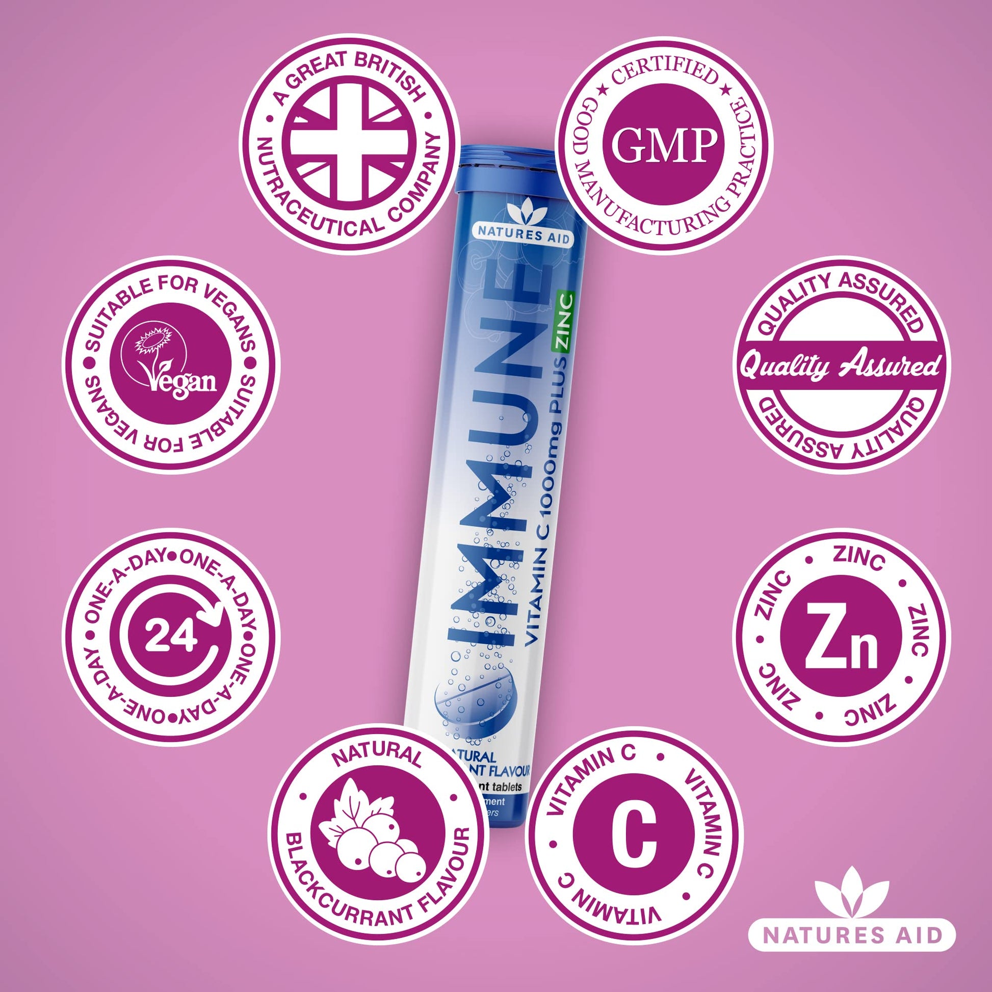 - Natures Aid immune effervescent contains 1000mg Vitamin C plus Zinc