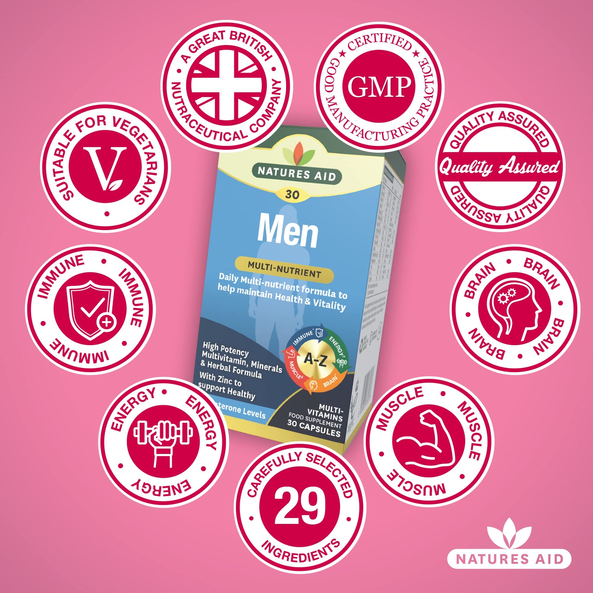 Natures Aid Men's Multi-Vitamins and Minerals Capsules (29 Essential Vitamins and Minerals + Superfood Complex, 30 Capsules, Suitable for Vegetarians, Made in the UK)