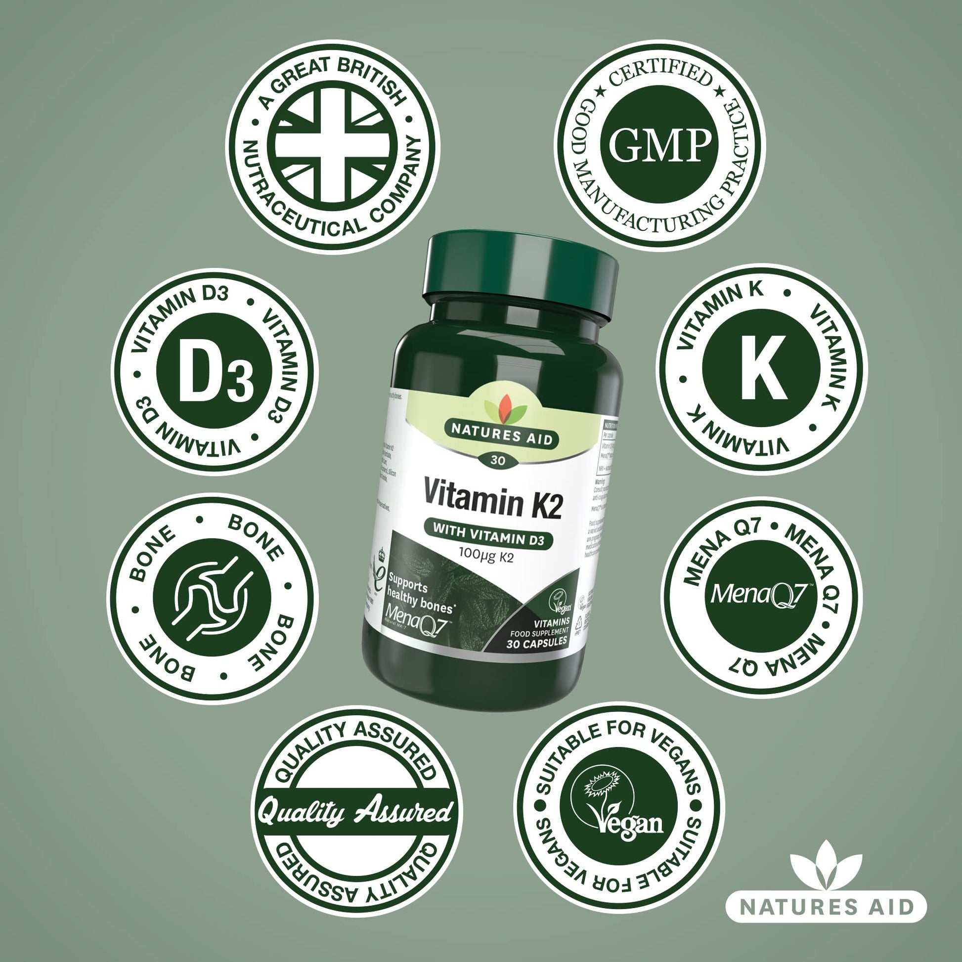 Natures Aid MenaQ7, natural vitamin K2 has been formulated with vitamin D3 for the maintenance of normal bones and absorption of calcium.More Info