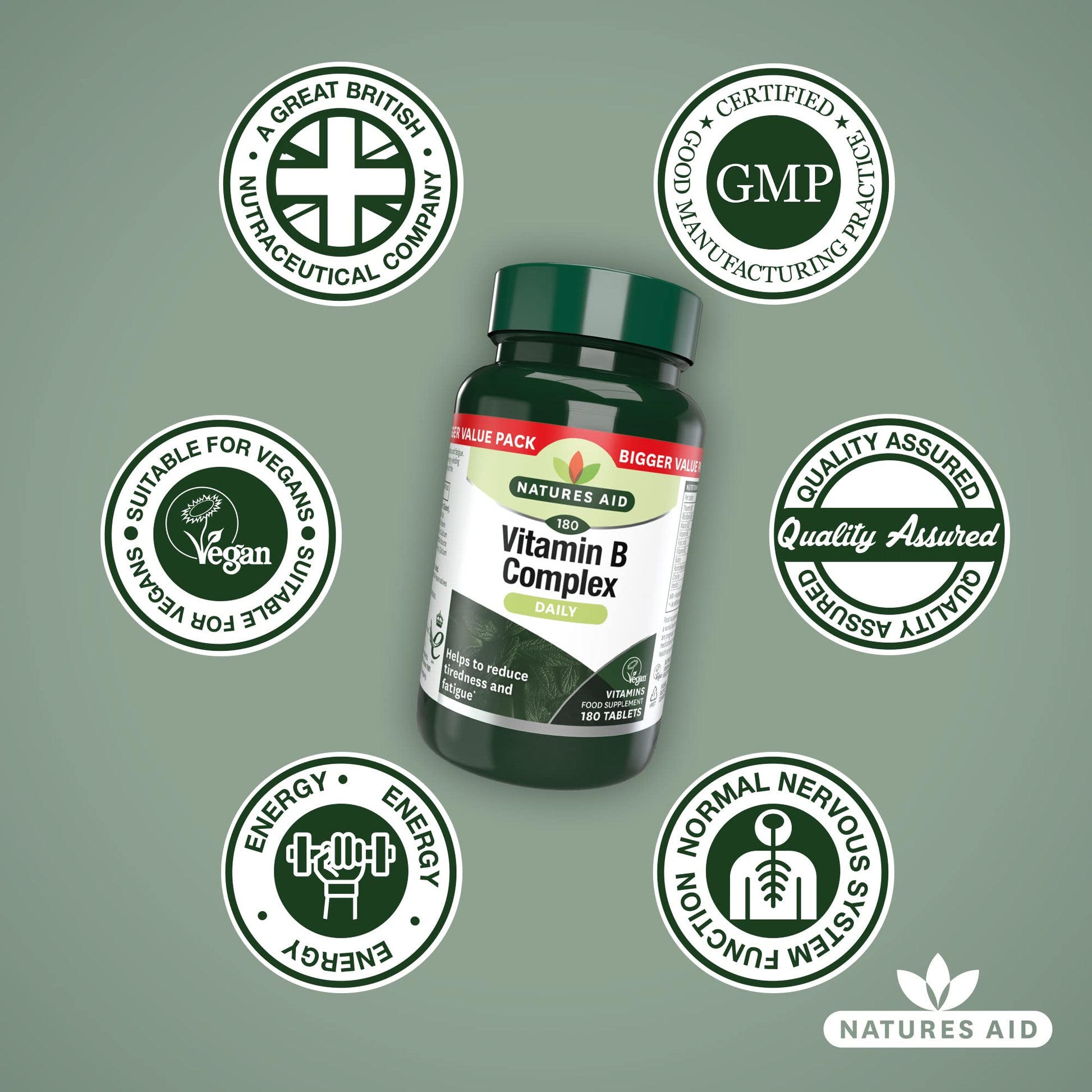 Natures Aid Vitamin B Complex - 180 Tablets - Complete B1 B2 B3 B5 B6 & Vitamin B12 Supplement Support for Energy Tiredness Fatigue Metabolism Function - Vegan Not Gummies or Capsules 6 Months Supply