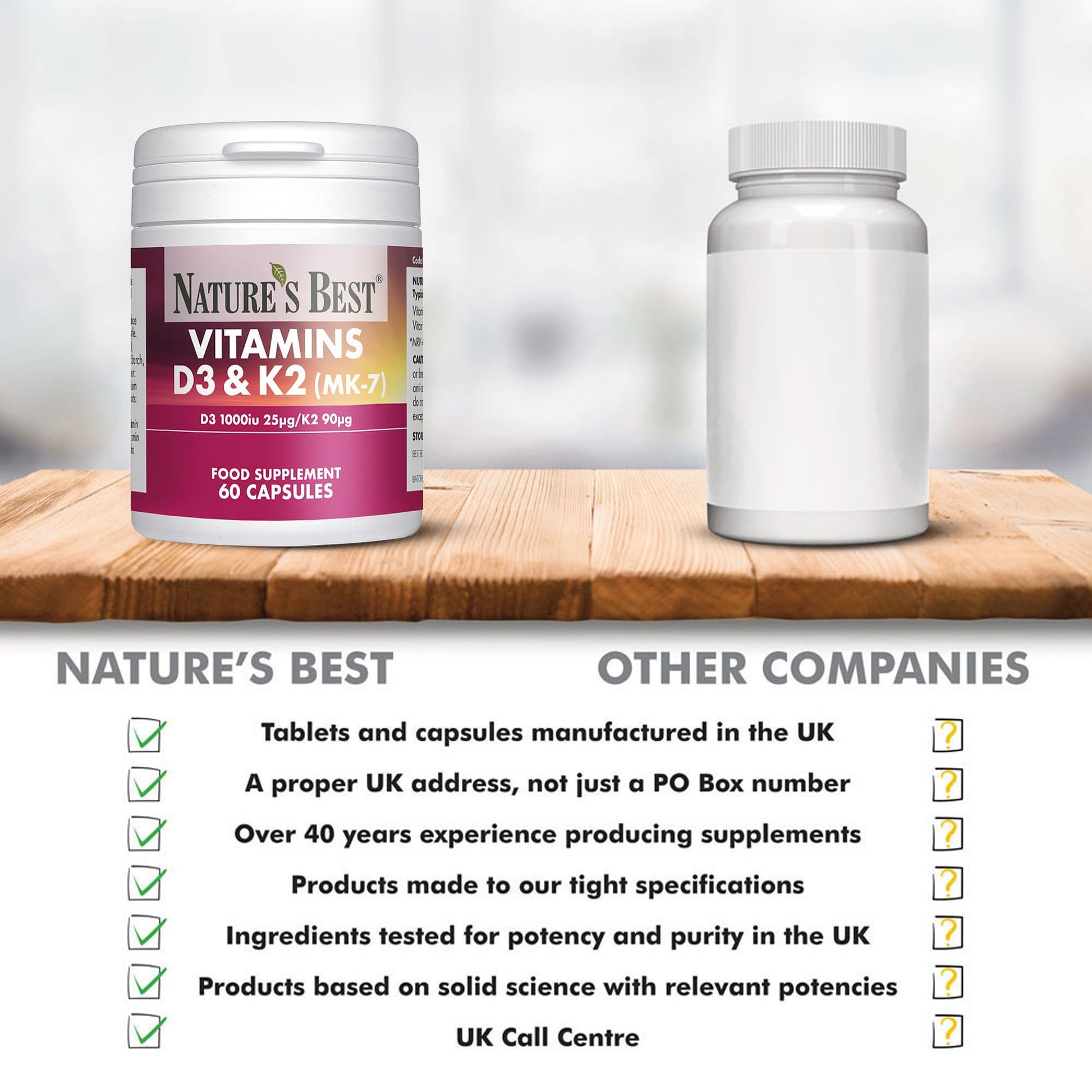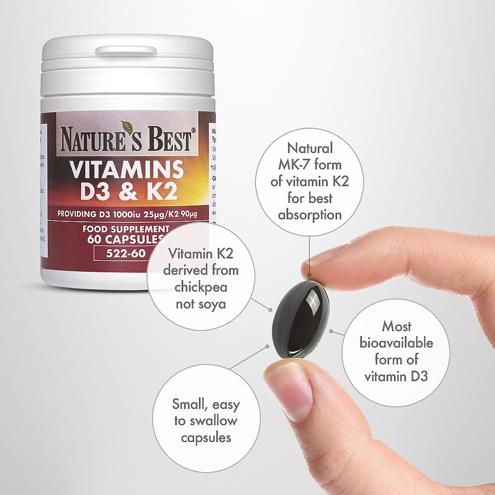Modern diets generally don't provide enough vitamin D3 and K2. You can now optimise your intake with our high-strength, broad-spectrum formula that comes in a convenient and flexible dose an excellent choice for those who want to support their bone health and immunity. Each easy-to-swallow, taste-free capsule provides an impressive 25µg (500%) vitamin D3 and 90µg (120% NRV) vitamin K2, both of which work synergistically in the body and contribute to the maintenance of normal bones. What do vitamin D3 and K2 contribute to? - Vitamin D3 contributes to the maintenance of normal bones, teeth, muscle function and the normal absorption and utilisation of calcium/ phosphorus. Vitamin D3 also contributes to normal cell division and the normal function of the immune system, and healthy inflammatory responses. Find out more about vitamin D here. - Vitamin K2 contributes to the maintenance of normal bones and blood coagulation. Find out more about vitamin K here. Our bodies obtain vitamin K as vitamin K1 (phylloquinone), found in green leafy vegetables, and vitamin K2 (menaquinone), which is naturally produced by the live bacteria in our digestive tract. The body absorbs vitamin K2 better than K1, so we choose to use it in this formula. Vitamin K2 (menaquinone) exists in two forms: synthetic MK-4 and natural MK-7. Published studies suggest natural MK-7 is more bioavailable (readily absorbed) than synthetic MK-4. Manufactured using a unique extraction process, our vitamin K2 derives from chickpea protein, not soya (for people who need to avoid soya), our formula contains pure, natural, full-spectrum MK-7. We encapsulate our high-strength formula in small capsules not tablets to further aid absorption. We've suspended vitamin D3 and K2 in sunflower oil, along with rosemary extract and vitamin E, to keep it fresh and stable. To meet our strict quality standards, we manufacture and package our formulas in UK factories working to strict Good Manufacturing Practice (GMP).More Info