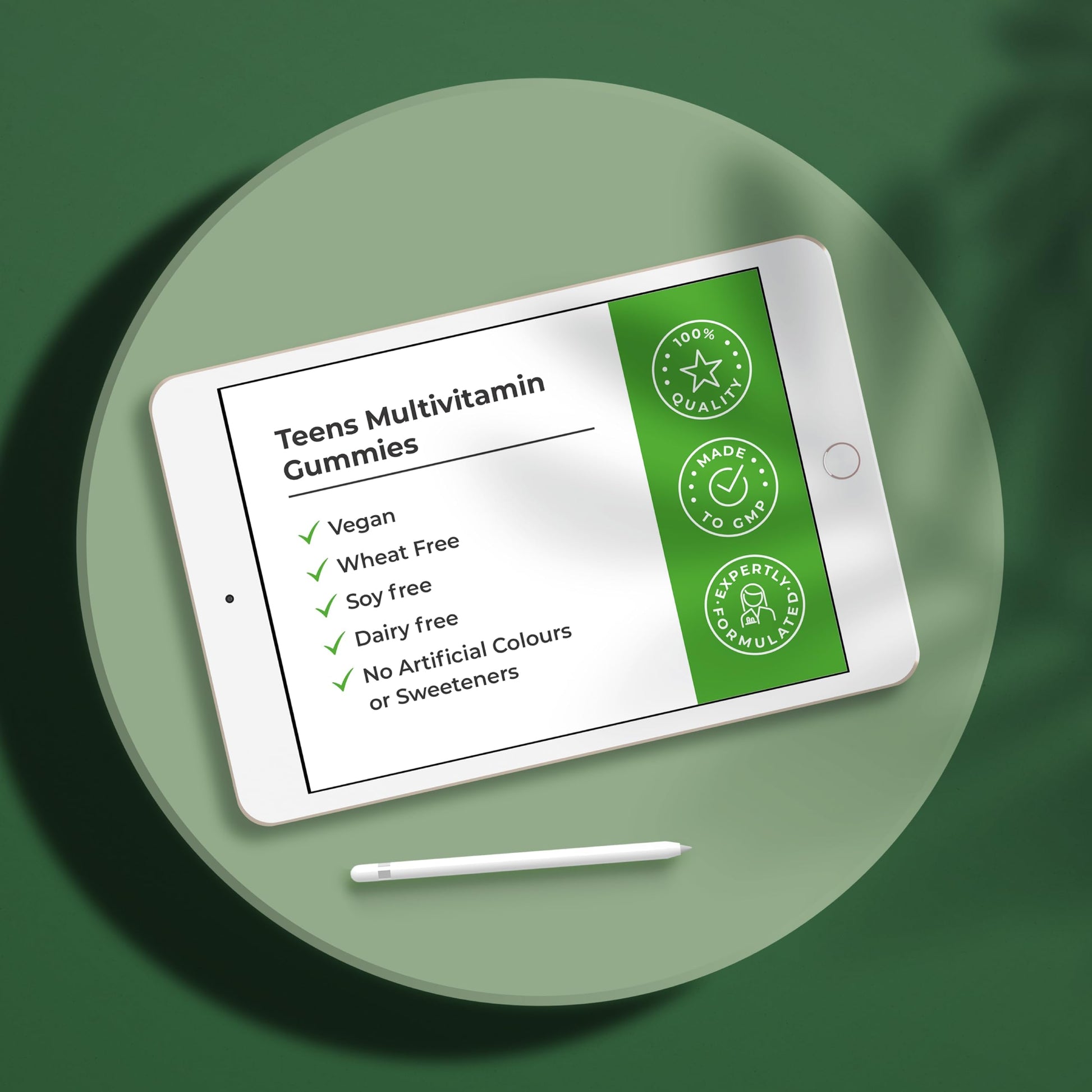 Our Teen multivitamin gummy supplement is specially formulated to support overall health and well-being. It is packed with essential vitamins and minerals, with each gummy providing comprehensive blend of nutrients. Simply take two (2) vegan gummies a day and reap the benefits of our multivitamin supplement!