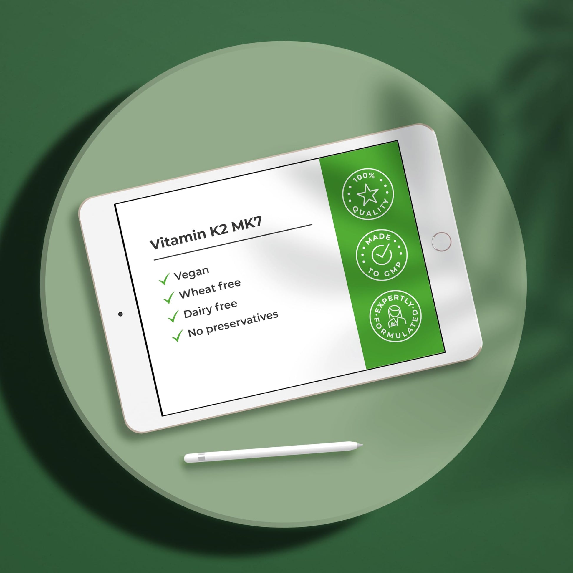 Our Vitamin K2 supplement delivers a high-strength dose of 100µg per tablet, featuring MK-7 Menaquinone, the highly bio active form of Vitamin K2.