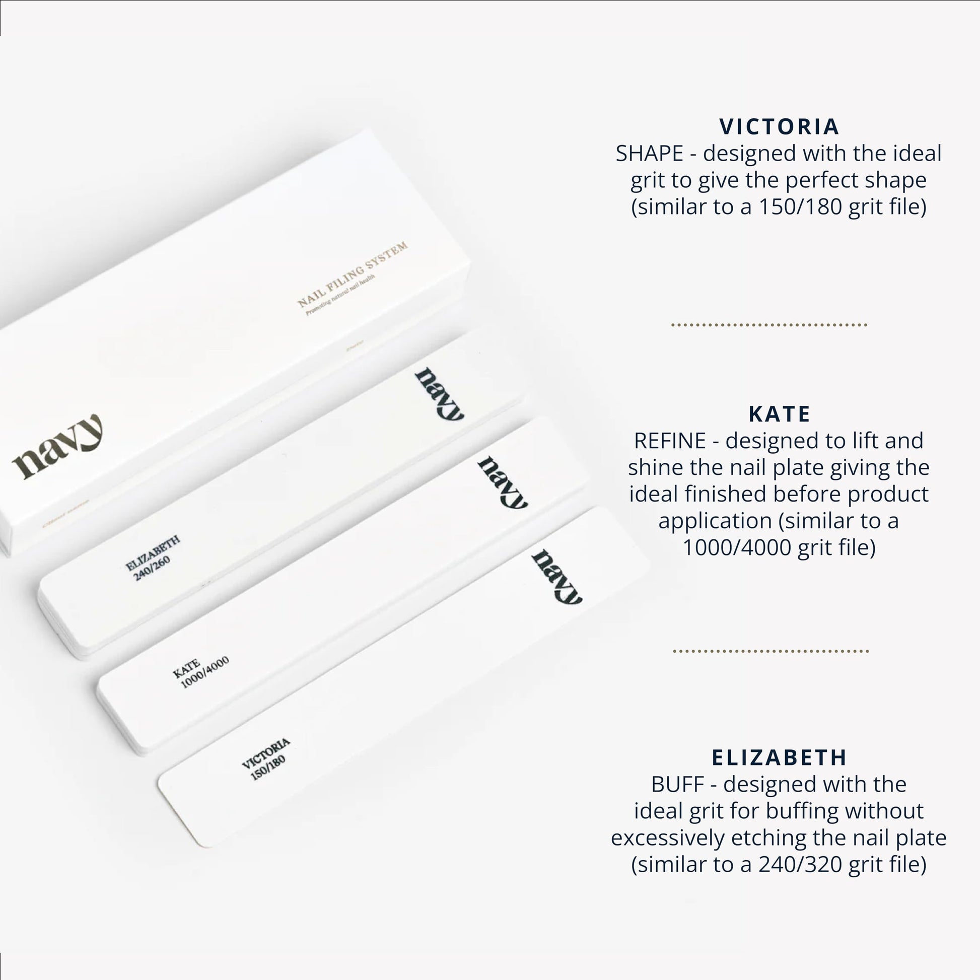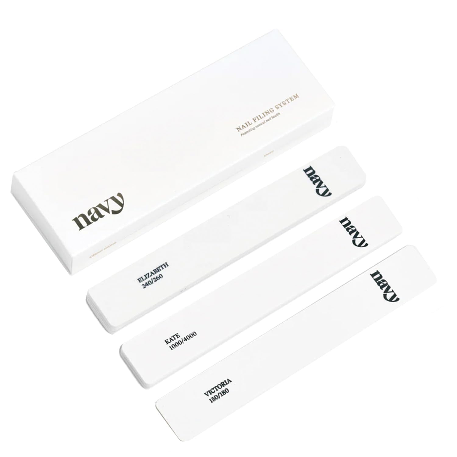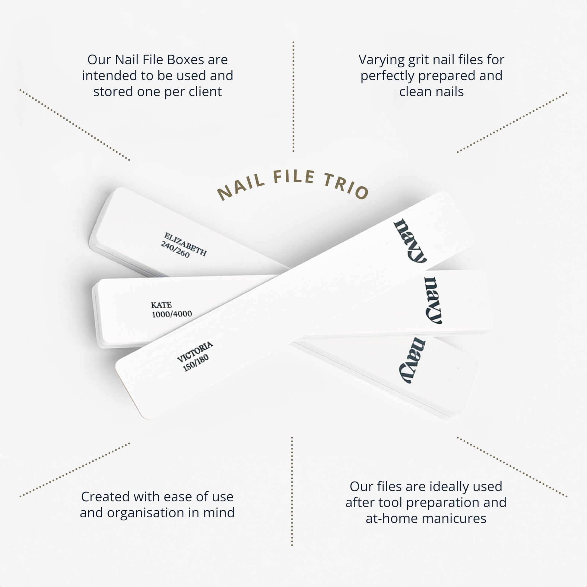 Elevate your nail care routine with the Navy Professional Nail File Trio Pack, featuring three expertly designed files—Victoria for shaping, Elizabeth for buffing, and Kate for refining. Each file is housed in a customizable box, perfect for personalising your client experience and enhancing organisation. Ideal for use after tool preparation, this trio ensures your nails are beautifully shaped, smooth, and ready for product application.More Info