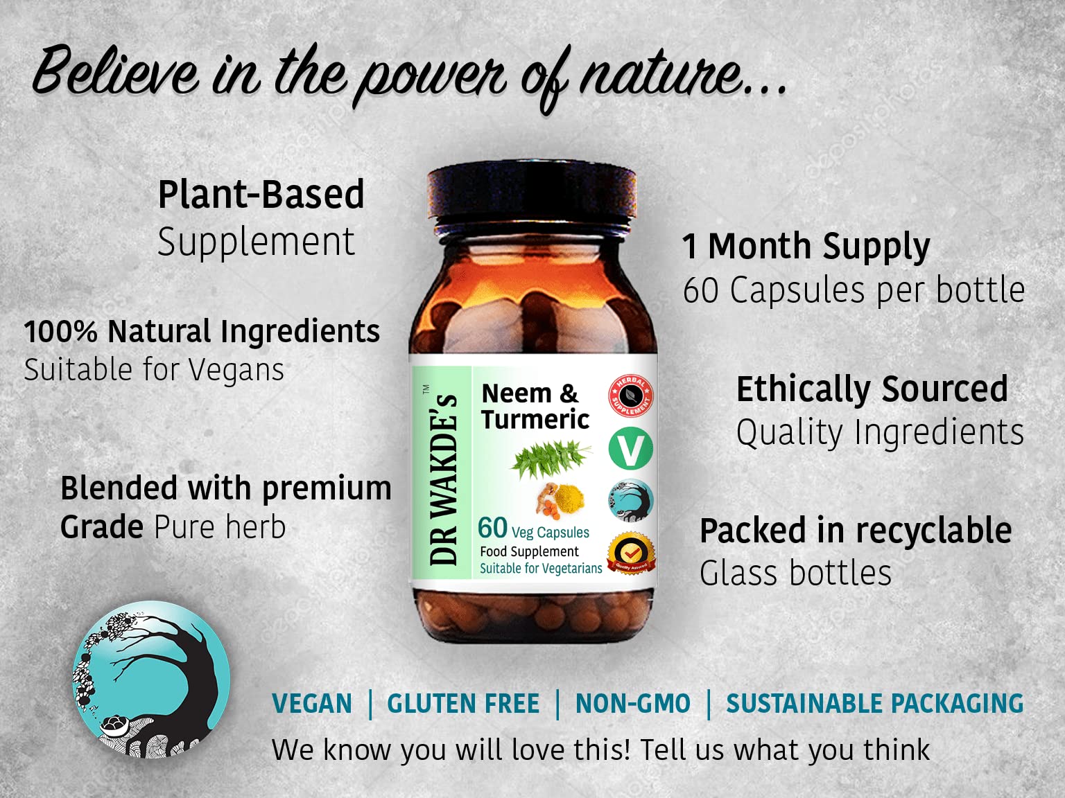 DR WAKDE'S Neem & Turmeric Capsules contain pure herbs blended together. Each herb is carefully dried to bring you the full potential of nature's goodness. DR WAKDE'S Neem & Turmeric capsules also use vegetarian and vegan friendly HPMC capsules. It is made with purely herbal ingredients and free from any additives or fillers.