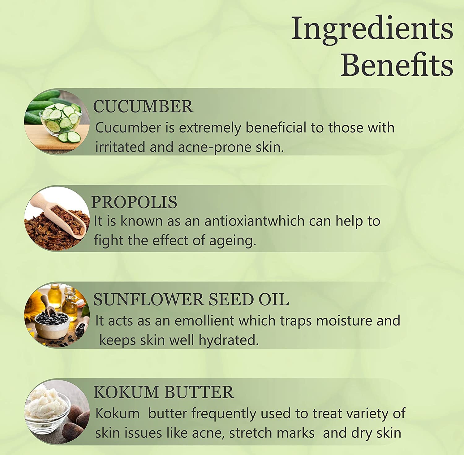 Cucumber provides instant and deep hydration. It soothes the skin and provides relief from irritation with its cooling effect. This natural moisturizer contains essential vitamins and minerals required by the skin. Propolis fights against ageing skin, reduces wrinkles and tightens skin. Sunflower seed oil keeps skin moisturized naturally. Kokum butter is effective in acne prone skin, and dry skin. Deep Moisturizing Cream: The natural cream contains potent moisturizing ingredients, which help in keeping the skin hydrated by retaining moisture deep inside. This provides gentle skin care. Suitable for All Skin Types- The face cream can be used on all skin types. This soothing cream is suitable for daily application. It provides deep and instant moisturizing effect on the skin. For Men & WomenMore Info