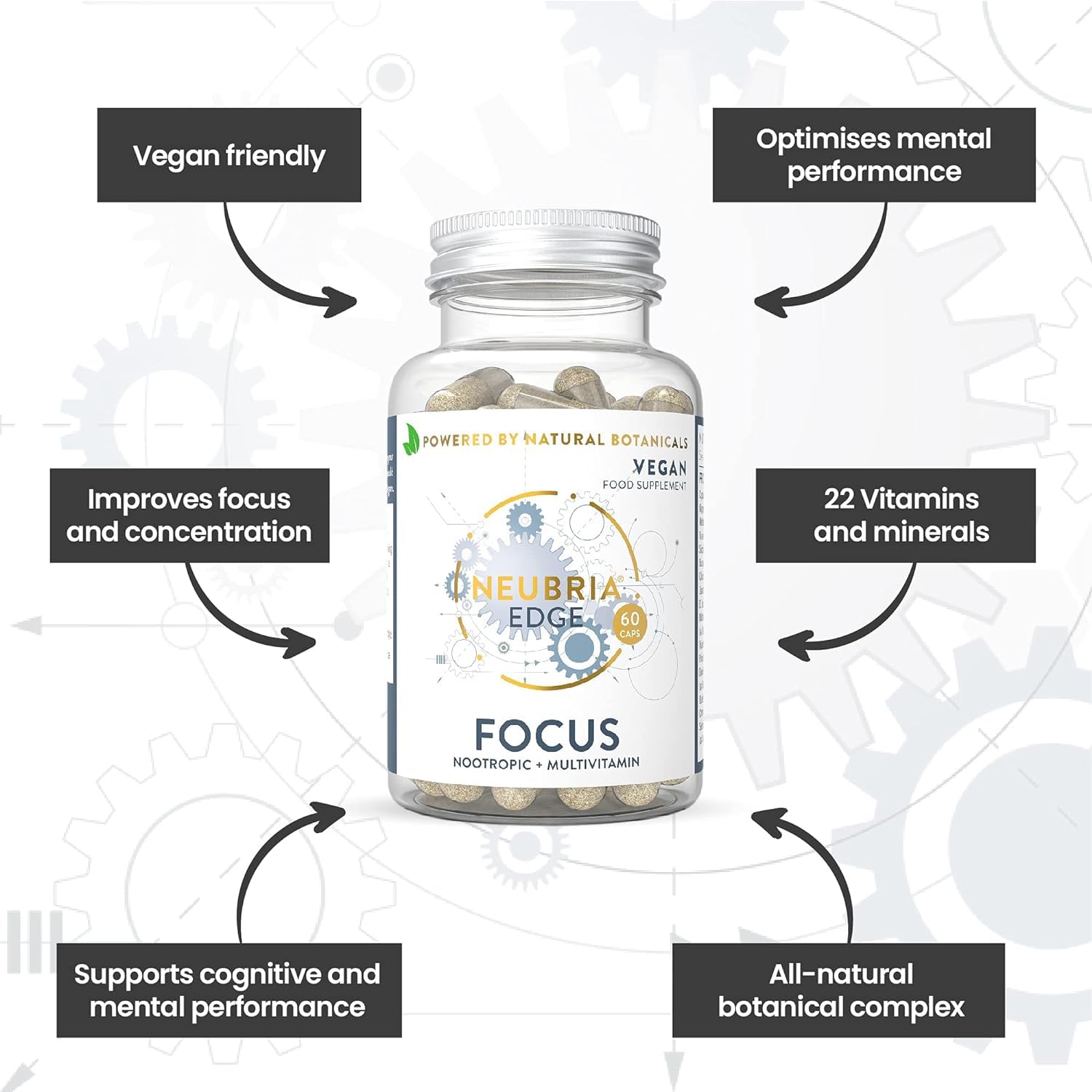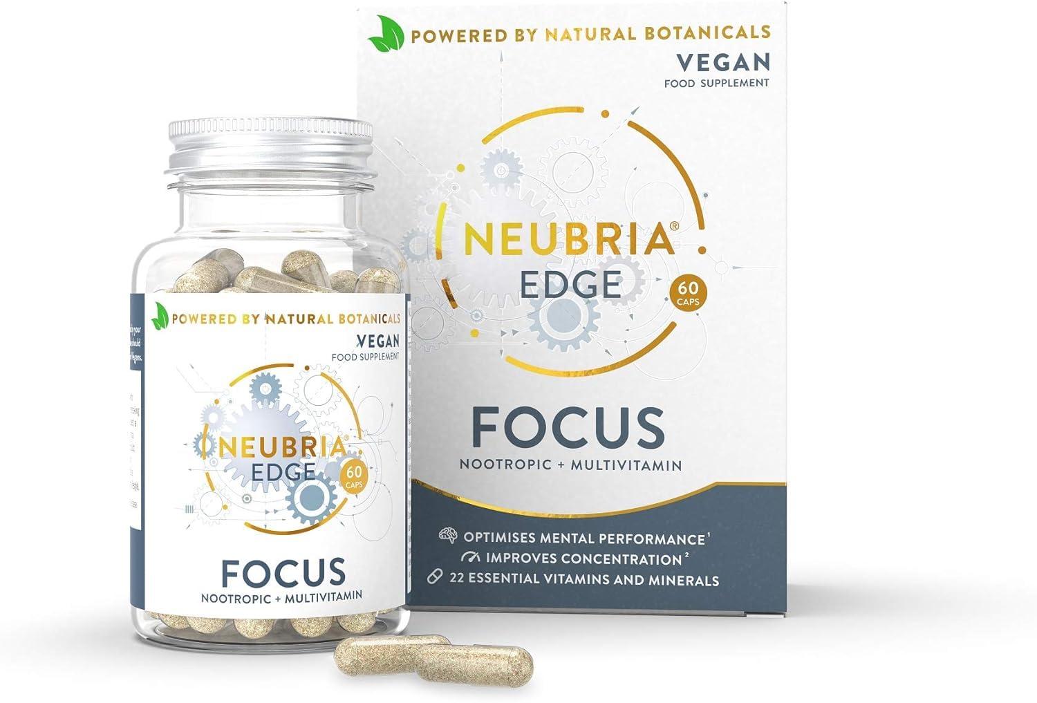 NEUBRIA Edge Focus Formula Nootropic supplements and Multivitamin, Memory Booster helps to Improve Concentration and Focus with 22 Essential Vitamins and Minerals - 60 Capsules - by Neubria