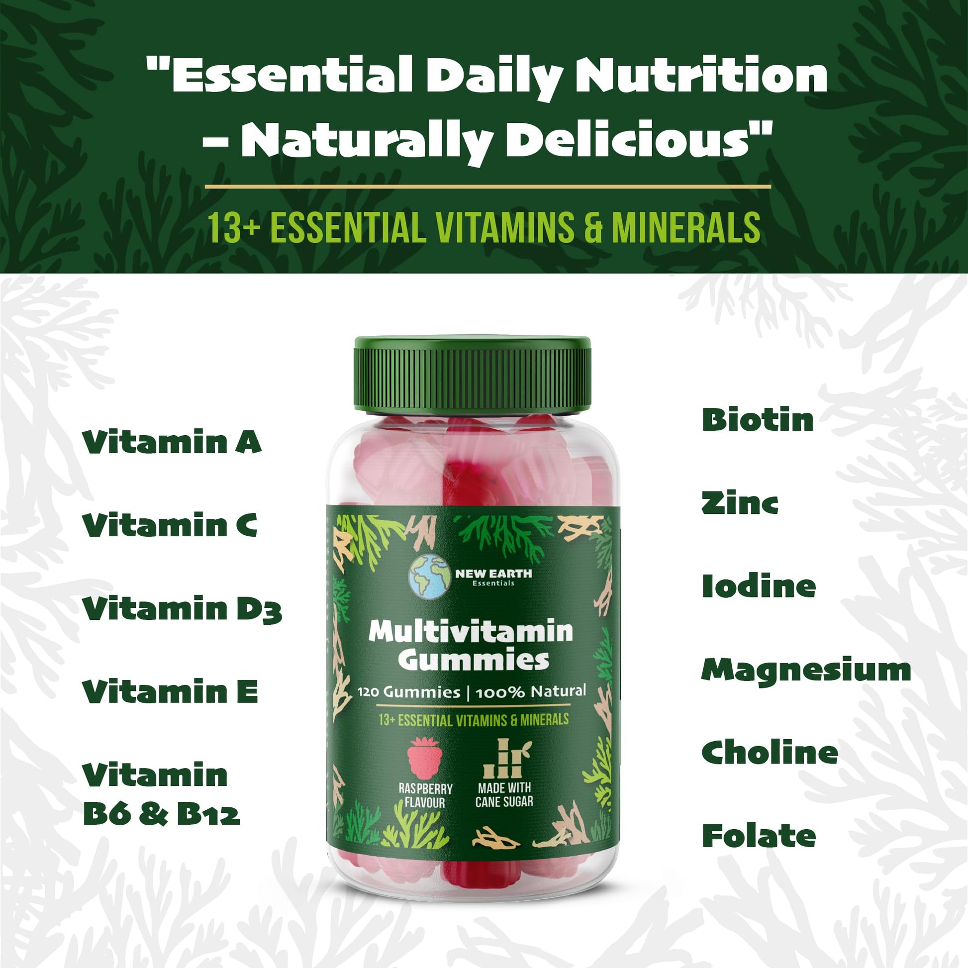 Your Daily Dose of Nutrition in a Gummy Simplify your wellness routine with New Earth Essentials’ Multivitamin Gummies. Specially crafted with 13 essential vitamins and minerals, these gummies provide comprehensive support for your overall health and vitality in a delicious, convenient format. What Makes Our Multivitamin Gummies Stand Out? Essential Vitamins & Minerals: Boost your daily intake of key nutrients like Vitamin A for eye health, Vitamin C for immune support, and Vitamin D for bone strength. Natural Sweetness: Sweetened with cane sugar and stevia, our gummies deliver a satisfying taste without artificial sweeteners or synthetic additives. Delicious Strawberry Flavor: Naturally flavored for a delightful strawberry taste, making them a treat to enjoy every day. Easy to Digest: Gentle on your stomach, with a clean ingredient list that includes apple juice concentrate and purple carrot juice for natural coloring. Perfect for Everyday Wellness Our multivitamin gummies are designed for adults seeking a convenient and enjoyable way to supplement their diet. Whether you’re looking to support immunity, energy, or overall wellness, these gummies are the perfect addition to your routine. How to Use Take two gummies daily, preferably with a meal. Each bottle contains 60 gummies, providing a 30-day supply of essential nutrients. 100% Natural, 100% Delicious Free from artificial flavors, colors, and preservatives, our gummies are made with natural ingredients and are suitable for vegan and gluten-free diets. Why Choose New Earth Essentials? At New Earth Essentials, we believe in providing high-quality supplements crafted from the finest ingredients. Our multivitamin gummies are no exception, combining natural sweetness, essential nutrients, and a commitment to wellness in every bite.More Info