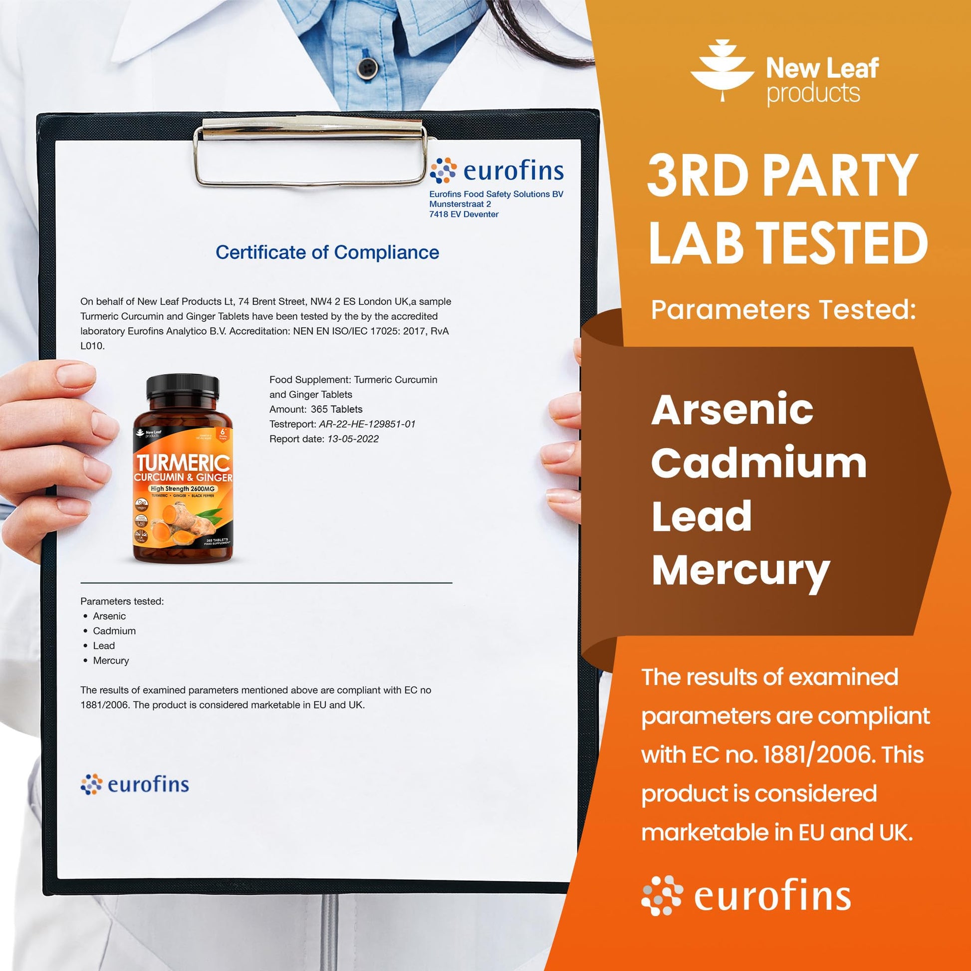 NEW LEAF PRODUCTS Turmeric Tablets 2600mg High Strength with Black Pepper & Ginger (6 Months Supply) Active 95% Turmeric Curcumin Supplements 365 Tablets Not Capsules, Vegan, UK Made by New Leaf