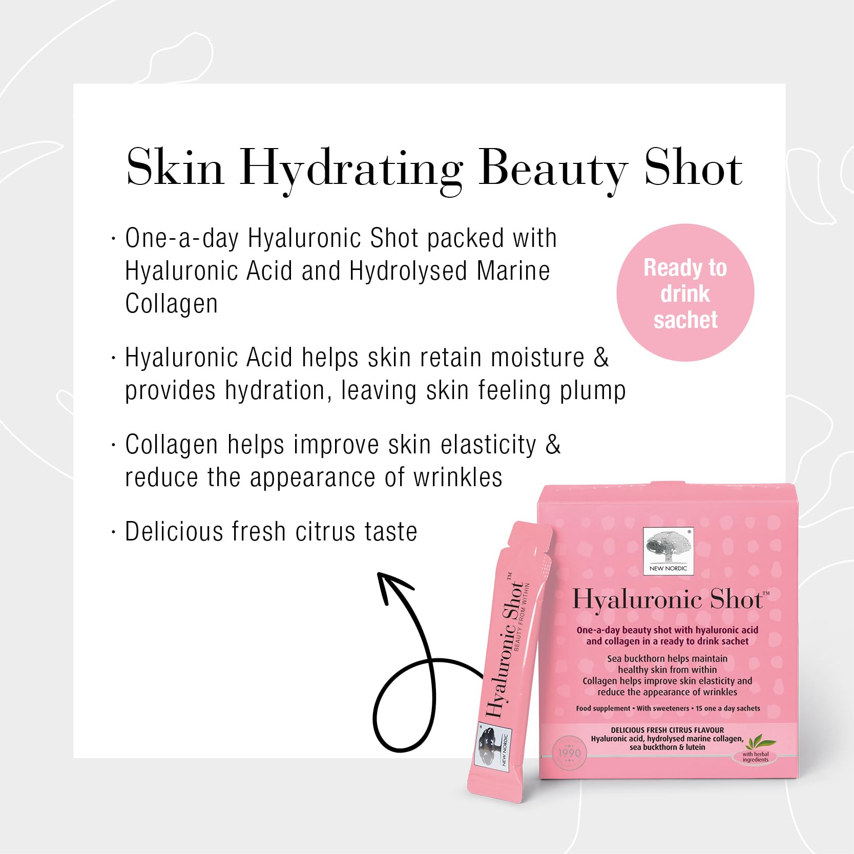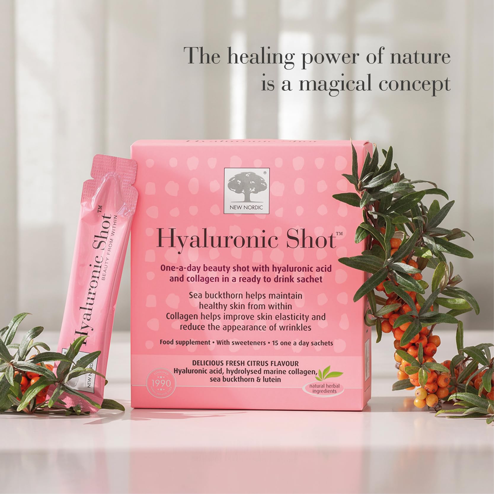 New Nordic Hyaluronic Shot | Hyaluronic Acid with Marine Collagen Supplement | to Improve Skin Elasticity and Reduce Wrinkles | Ready to Drink Fresh Citrus Flavour | 15 Sachets