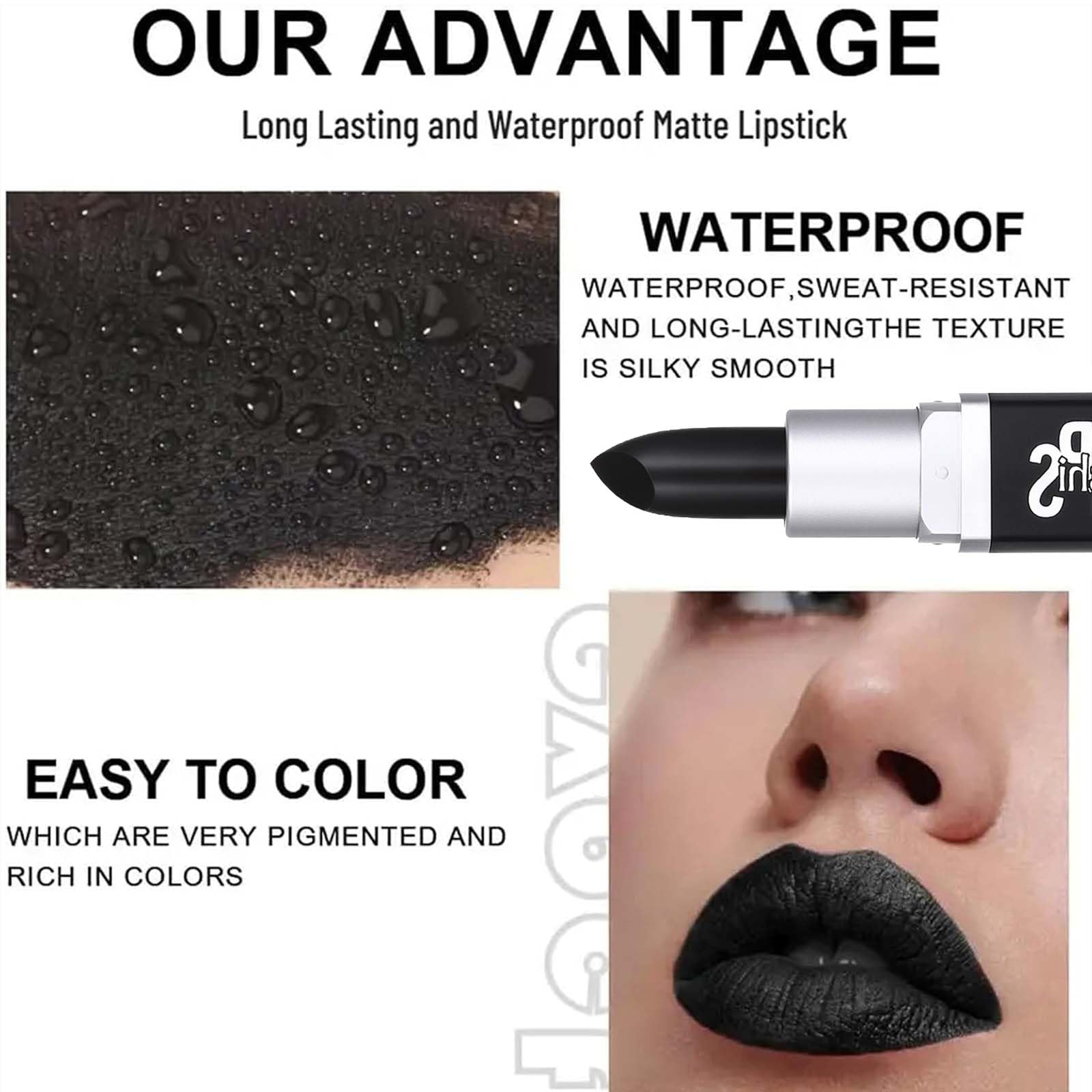 This matte black lipstick is the perfect choice for a dramatic Halloween make up or cosplay event. With its 24-hour wear formula and waterproof formulation, the lipstick stays in place all day or night long without running or smudging. Whether you want to portray a terrifying witch, scary vampire, or any other spooky creature, this lipstick will add the right dose of darkness and intensity to your look. Wear it alone for a goth makeup or combine it with other makeup products to complete your costume.