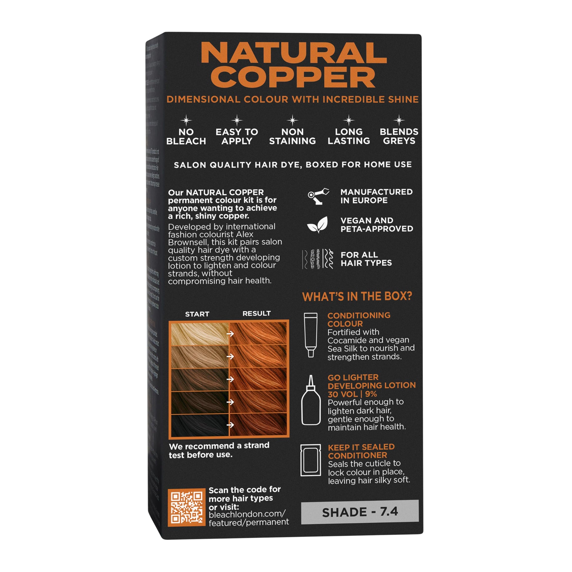 Go lighter with the No Bleach London Natural Copper permanent colour kit designed to transform your hair to a rich copper that’s full of reflection. Developed by fashion hair royalty Alex Brownsell and her team of colour experts, this kit pairs salon-quality pigments with custom strength developing lotion to gently colour your hair and blend greys, ensuring glowy and natural results that are not too pigmented or oversaturated. The pioneering vegan formula contains Cocamide and Sea Silk to nourish and strengthen strands for dimensional colour without compromising hair health. The kit also comes with a specially formulated post colour treatment ‘Keep it Sealed’ to seal the cuticle and lock colour in place, leaving hair incredibly shiny and silky soft. NO BLEACH BLENDS GREYS FOR ALL HAIR TYPES EASY TO APPLY NON-STAINING LONG LASTING MANUFACTURED IN EUROPE VEGAN AND PETA-APPROVED Trust in a decade of colour mastery with BLEACH LONDON: Where Passion Meets Expertise. Born from the creative genius of hairstylist Alex Brownsell, what began as kitchen sink experiments has revolutionised the hair industry. Pioneering the world's first colour-centric salon, we've expanded our horizons over a decade, with four prime locations and a trailblazing product range. Today, our commitment to innovation and excellence has made us a global sensation, delivering unparalleled hair care and colour to enthusiasts worldwide. Bleach London is a proudly independent, female founded and professionally led hair colour brand.More Info