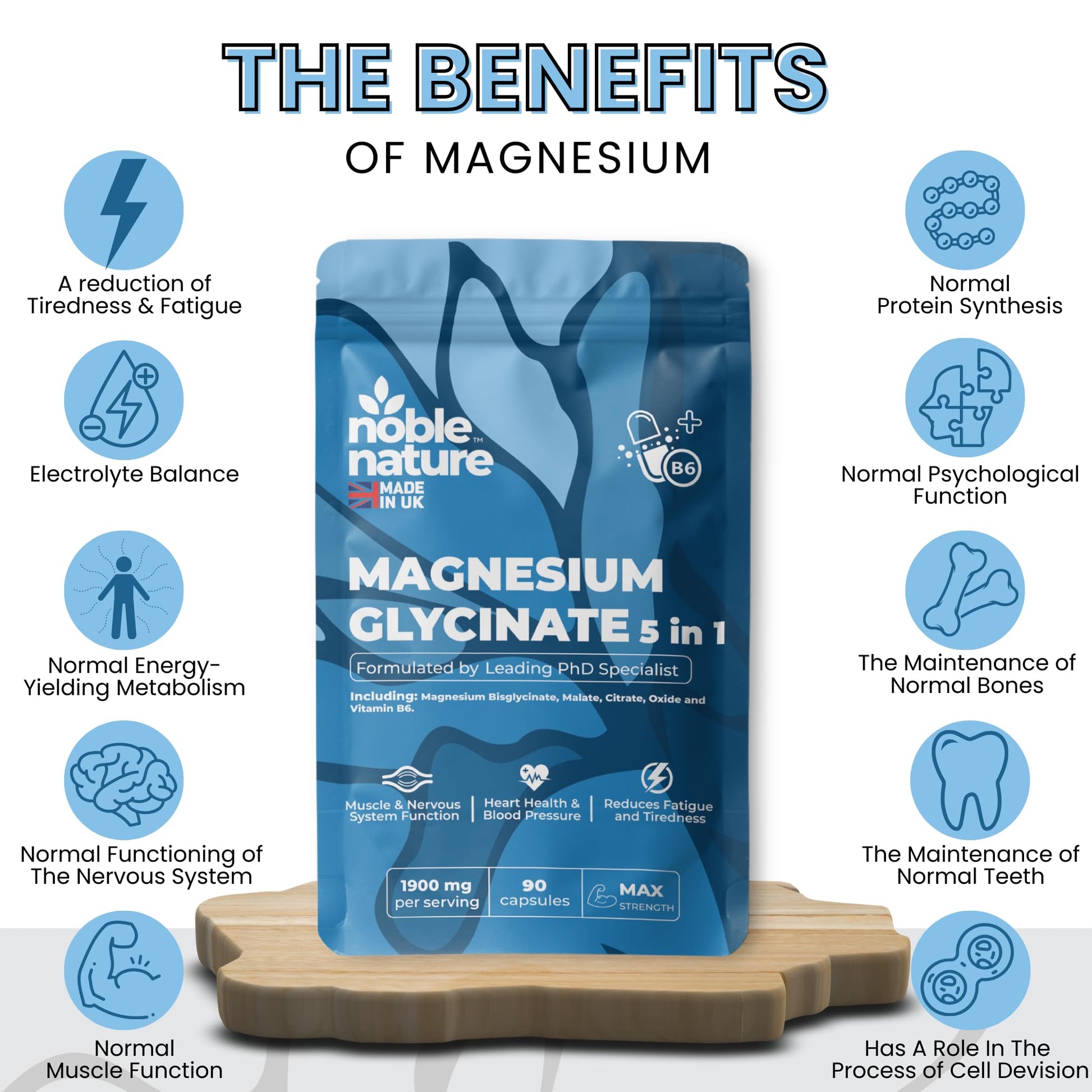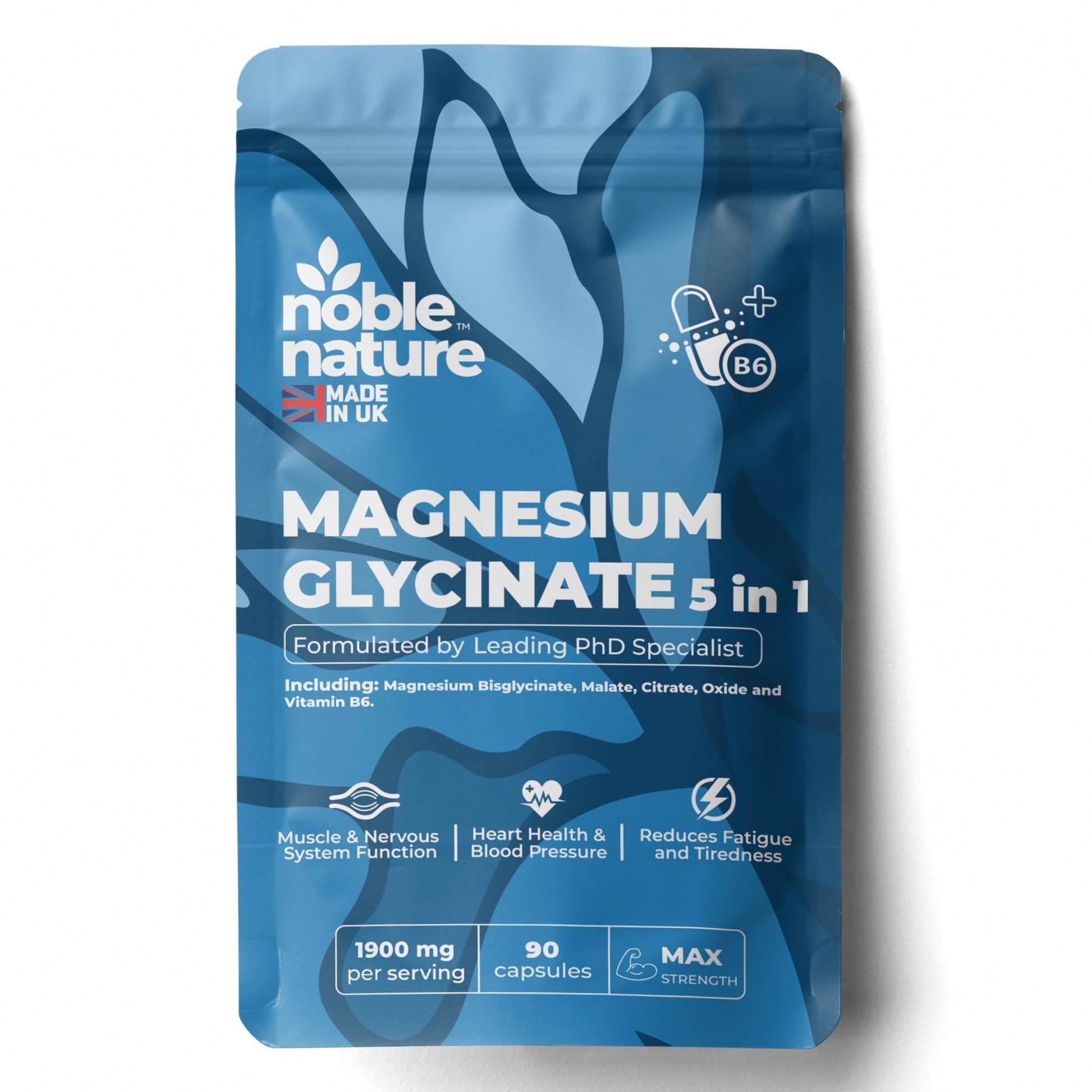 NobleNature Magnesium Glycinate 5-in-1 Complex Formulated by PhD Expert High Strength 1900mg Supplements as Bisglycinate, Malate, Citrate, Oxide & Vitamin B6-90 GMO Free Capsules, 384mg Elemental, UK Made (90)