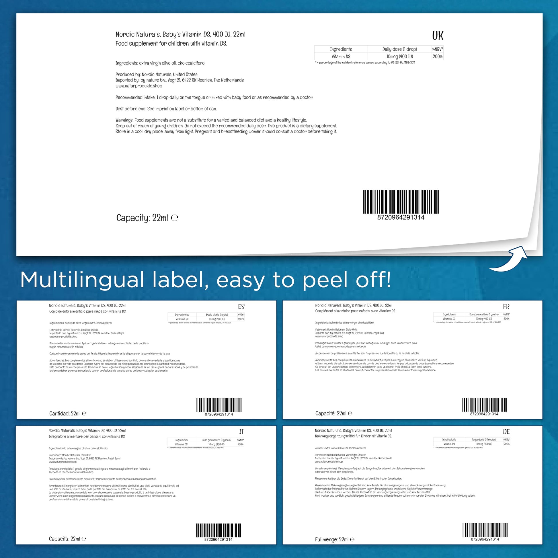 The vitamin D3 in this Nordic Naturals product is in the form of cholecalciferol, which is derived from lanolin (wool fat). With this high-dose product, you give your baby 10mcg (400 IU) IU per drop daily.More Info