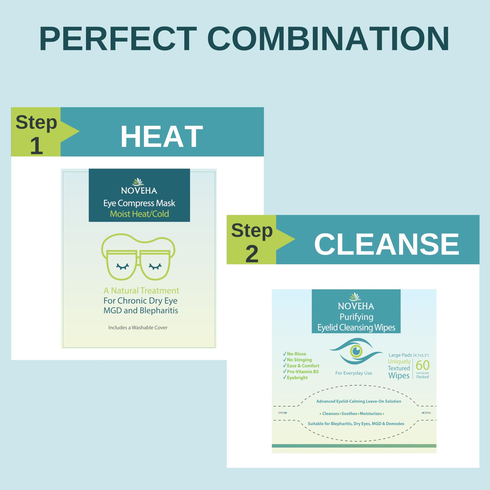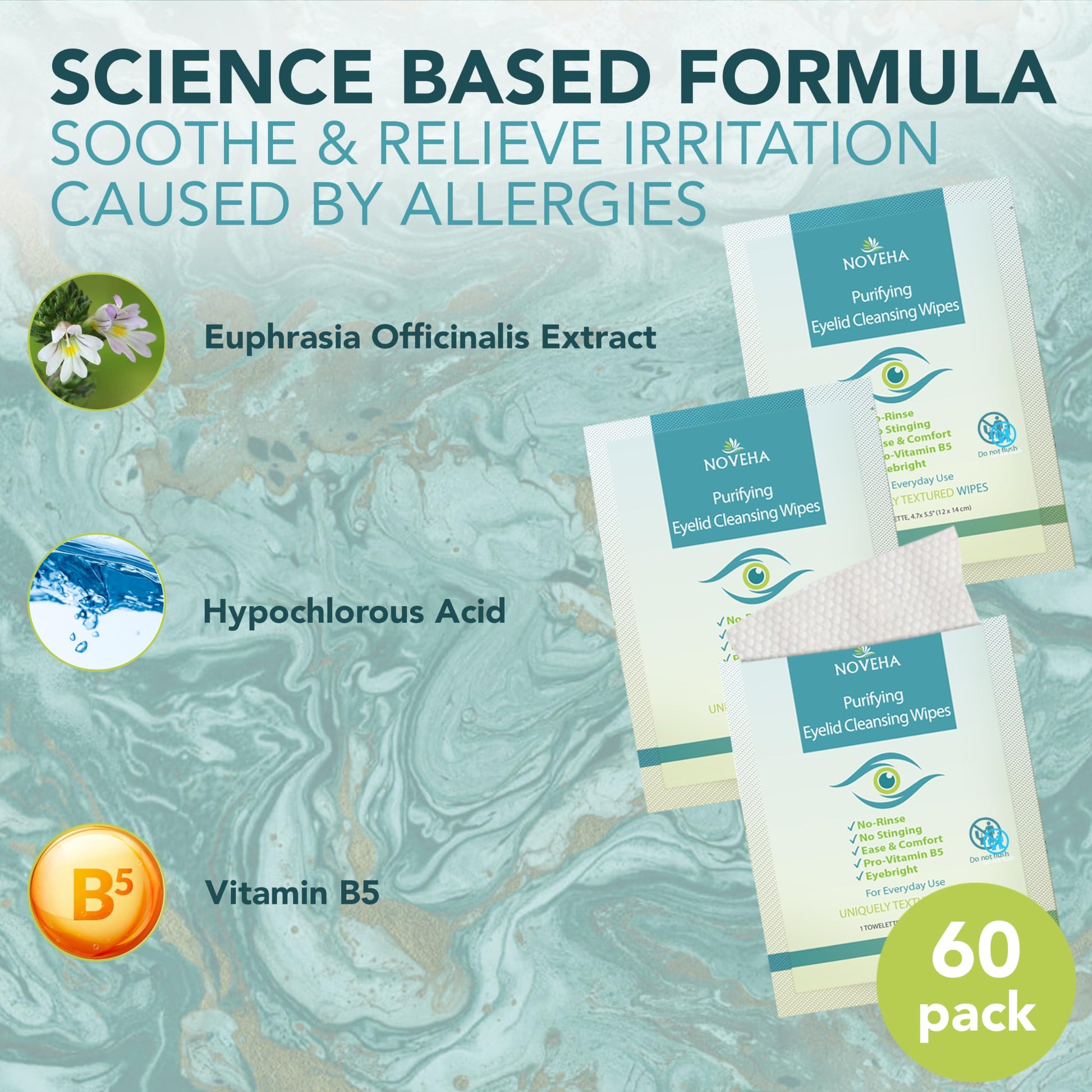 NOVEHA Antimicrobial Eyelid & Lash Wipes | For Itchy, Dry Eyes, Styes & Blepharitis, Gentle & Natural 0.02% Pure Hypochlorous Acid Cleansing Wipes, Hypoallergenic & Soothing For Sensitive Eyes, Pack of 60