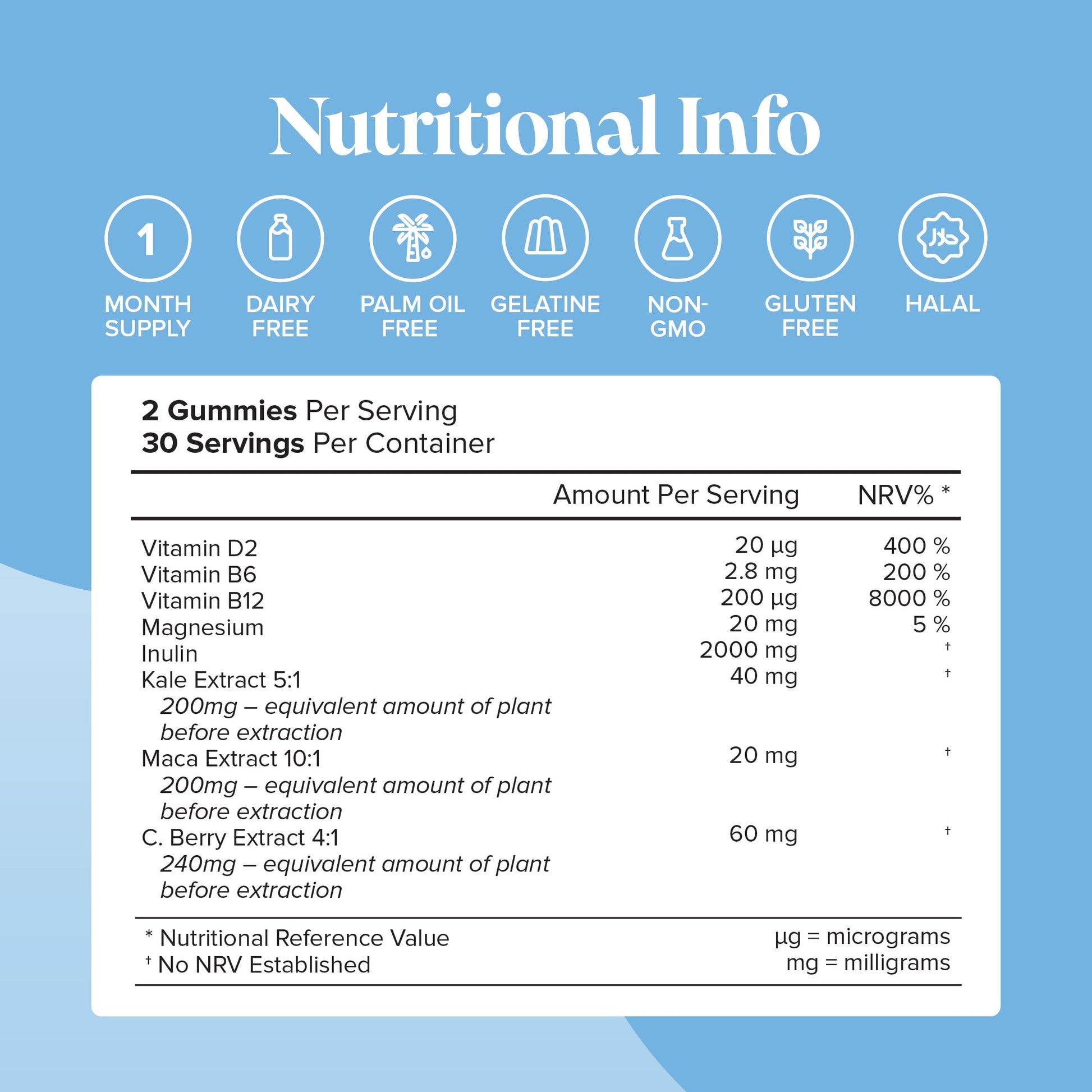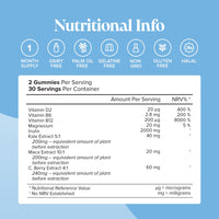 Energy Production: Our gummies are infused with Vitamin B12 and Maca Extract, known for their potential to support energy production and boost endurance and stamina.