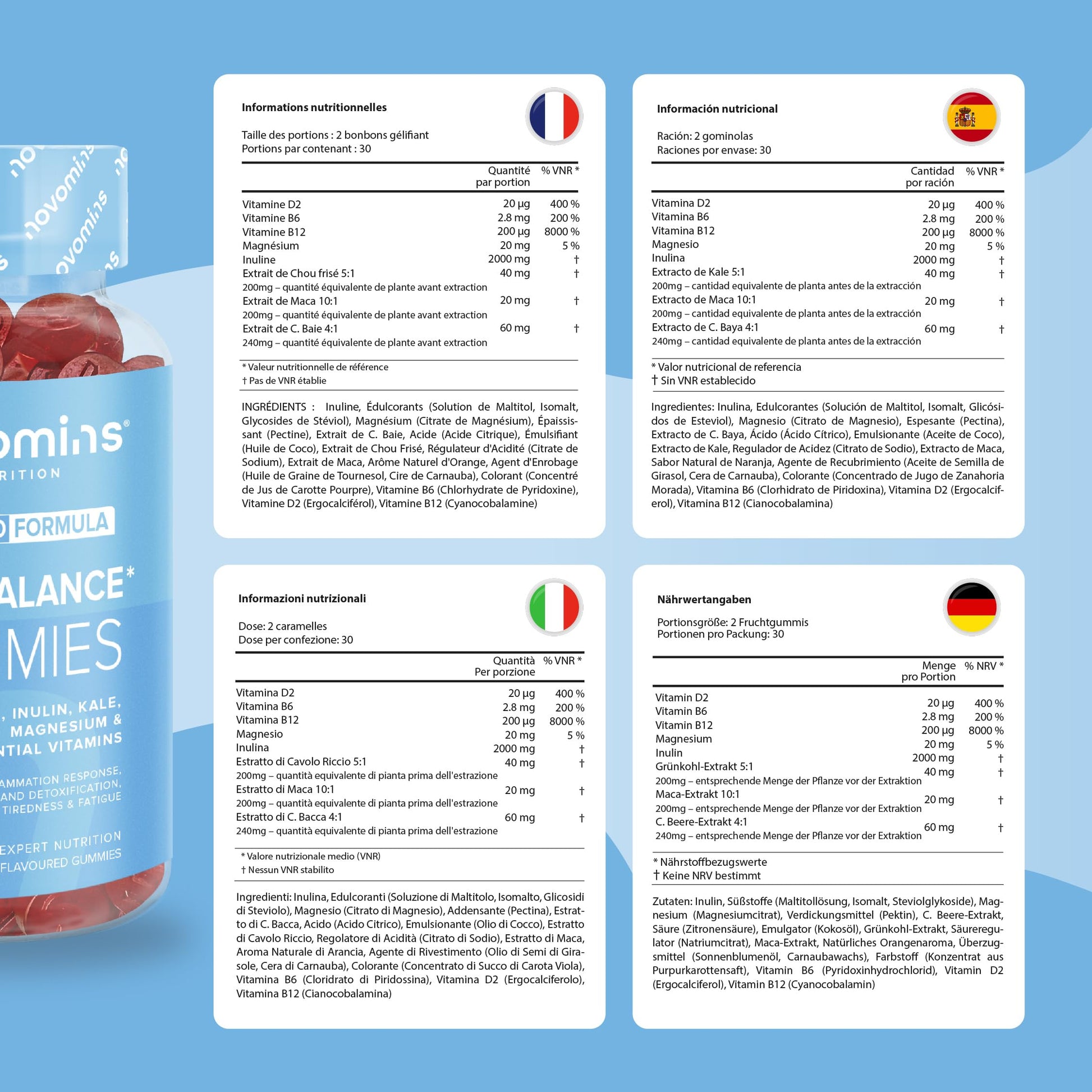 Novomins Estro Balance Gummies are specially designed for women of all ages. Estrogen dominance can affect hormonal balance and overall well-being. These gummies are infused with essential vitamins, minerals, and botanicals like Maca, Kale, Magnesium, Vitamin D, Vitamin B6, Vitamin B12, inulin, agnus castus, and other essential nutrients, designed to help maintain women's overall health.