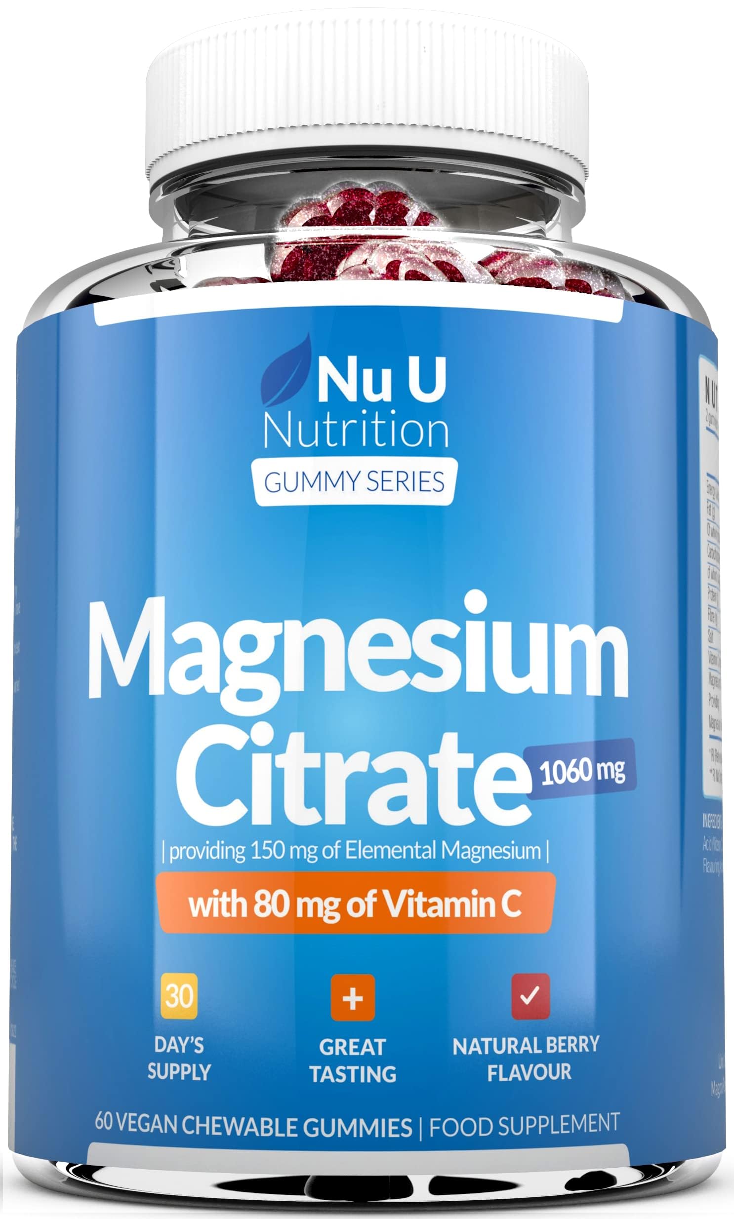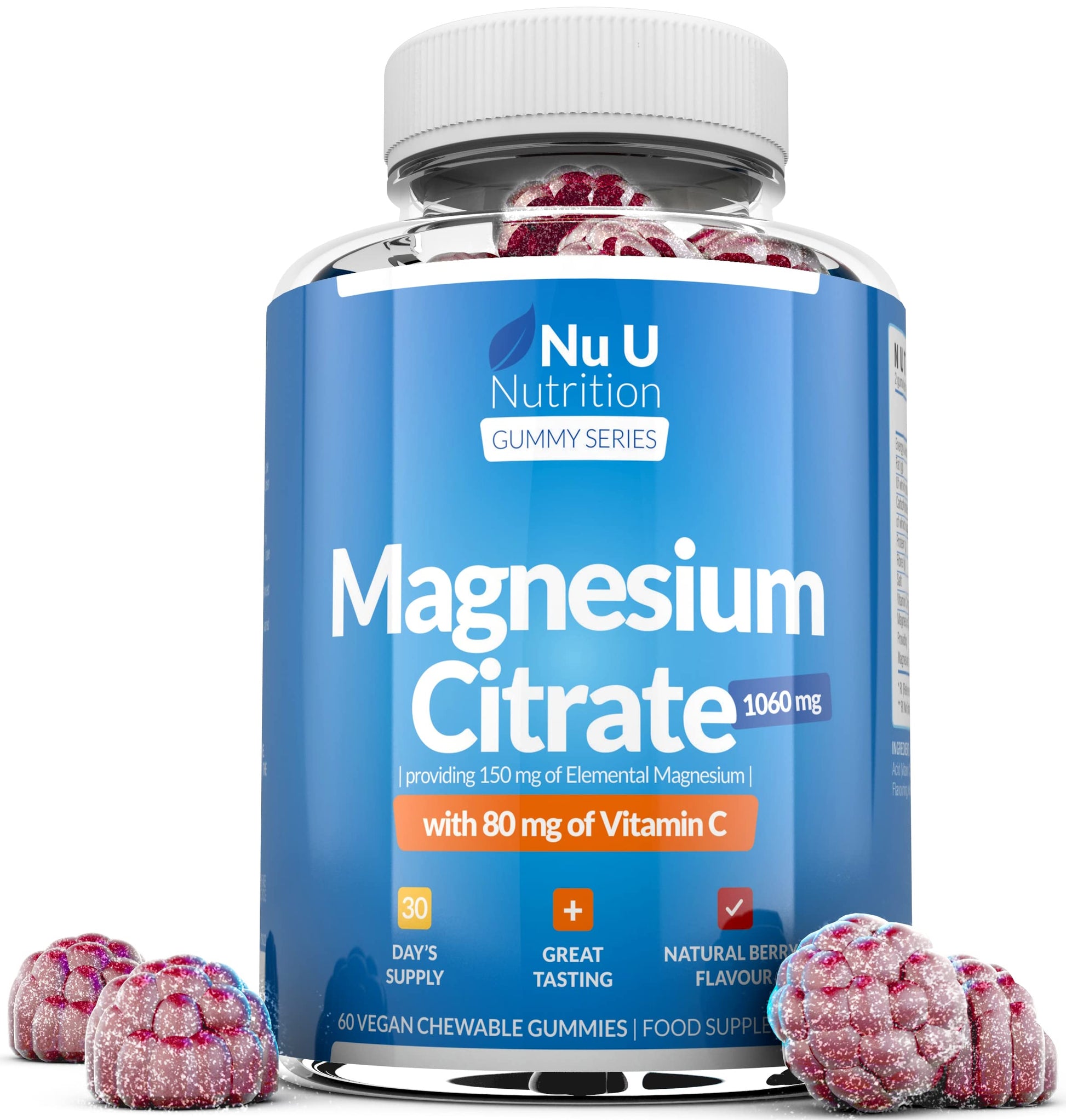 Nu U Nutrition Magnesium Gummies 1060mg for Adults and Kids (5+) - 60 Vegan Gummies - Berry Flavour - Providing 150mg of Elemental Magnesium & 80mg of Vitamin C - Magnesium Citrate Supplement