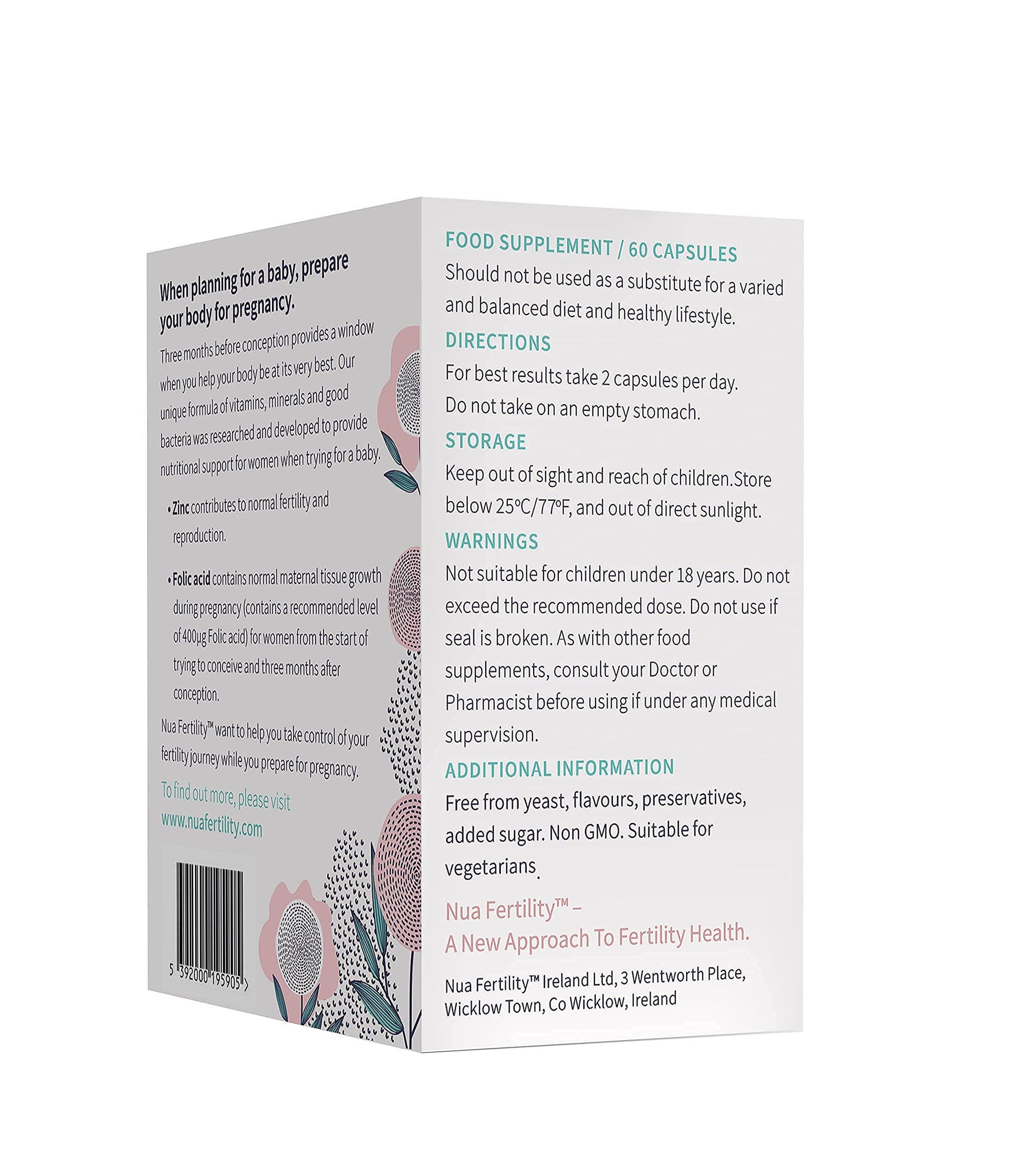 WHAT IS IT? NuaBiome Women is a natural, first-of-its-kind, pre-natal fertility supplement specially developed to help support female fertility. Our bespoke formula — which was created in conjunction with APC Microbiome Ireland — concentrates on the essential nutrients to support healthy conception and preparation for pregnancy combined with live bacteria that supports the gut to function optimally and supports vaginal health. WHO IS IT SUITABLE FOR? Women thinking, planning or trying to conceive. HOW DOES IT WORK? NuaBiome Women combines key fertility-supporting vitamins and minerals, including folate, selenium, zinc and Co- enzyme Q10, to optimise fertility, as well as a patented blend of good bacteria to help rebalance the gut and maximise the uptake of vitamins and minerals. WHAT ARE THE BENEFITS? Supports a healthy gut microbiome Supports nutrient synthesis and absorption Supports reduction in inflammation Promotes enhanced vaginal health Contains vitamins, minerals and good bacteria that support the regulation of hormones Provides micronutrients for enhanced fertility Contains antioxidants to protect egg and healthy ovulation, and zinc to enhance fertility RECOMMENDED USE: Two capsules per day 60 capsules. Do not take on an empty stomach. Additional Information: Free from yeast, flavours, preservatives, added sugar. Suitable for vegetarians.More Info