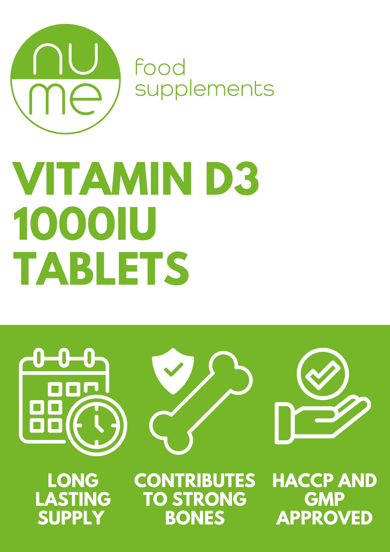 Known as the Sunshine Vitamin, D3 is naturally produced by the sun’s rays and absorbed by the body but many people suffer with a Vitamin D deficiency. Containing a 1000iu optimal serving of Vitamin D our tablets are strong, easy to swallow, practical and vegetarian friendly, all at an afforable price for all. Please note, food supplements should not be used as a substitute for a balanced diet and healthy lifestyle. About Nu Me Supplements: Welcome to Nu Me Supplements and our eBay store, we sell healthy supplements and super foods and vitamins in tablet and capsule form, from all round the world. We process and pack our products in house, we pride ourselves on customer service and offering a bespoke product and super-fast dispatch. Please do not hesitate to contact us if you have questions about the products we sell, we are proud of our customer service and will do our best to help you. We strive to offer our customers value for money quality health supplements, helping you enjoy a healthy and positive lifestyle. Nu Me Supplements: Nu Me Supplements is a registered trade mark, all text is copyright and unique to Nu Me Supplements, copying of text and trade mark will be reported. We purchase all the products we sell from UK GMP approved manufacturers only, if you are unhappy with the product you have received please contact us, we offer a full 30 day money back guarantee. Warnings: Food supplements must not be used as a substitute for a varied and balanced diet and a healthy lifestyle. Not recommended for use by pregnant or lactating women. If you are taking any medications, please consult a doctor before use. Discontinue use and consult a doctor if adverse reactions occur. Not intended for use by persons under the age of 18. Keep out of reach of children. Store in a cool, dry place. Disclaimer: Please note that these products are not intended to diagnose, treat, cure or prevent any illness or disease, for a diagnosis or treatment please consult your physician, doctor. Please Note: We cannot and do not give advice on people's health issues and wanting to use any of the products we sell to treat any illness, we suggest taking advice from your doctor or professional to treat any illness. Nu Me Supplements is a Registered Trade MarkMore Info