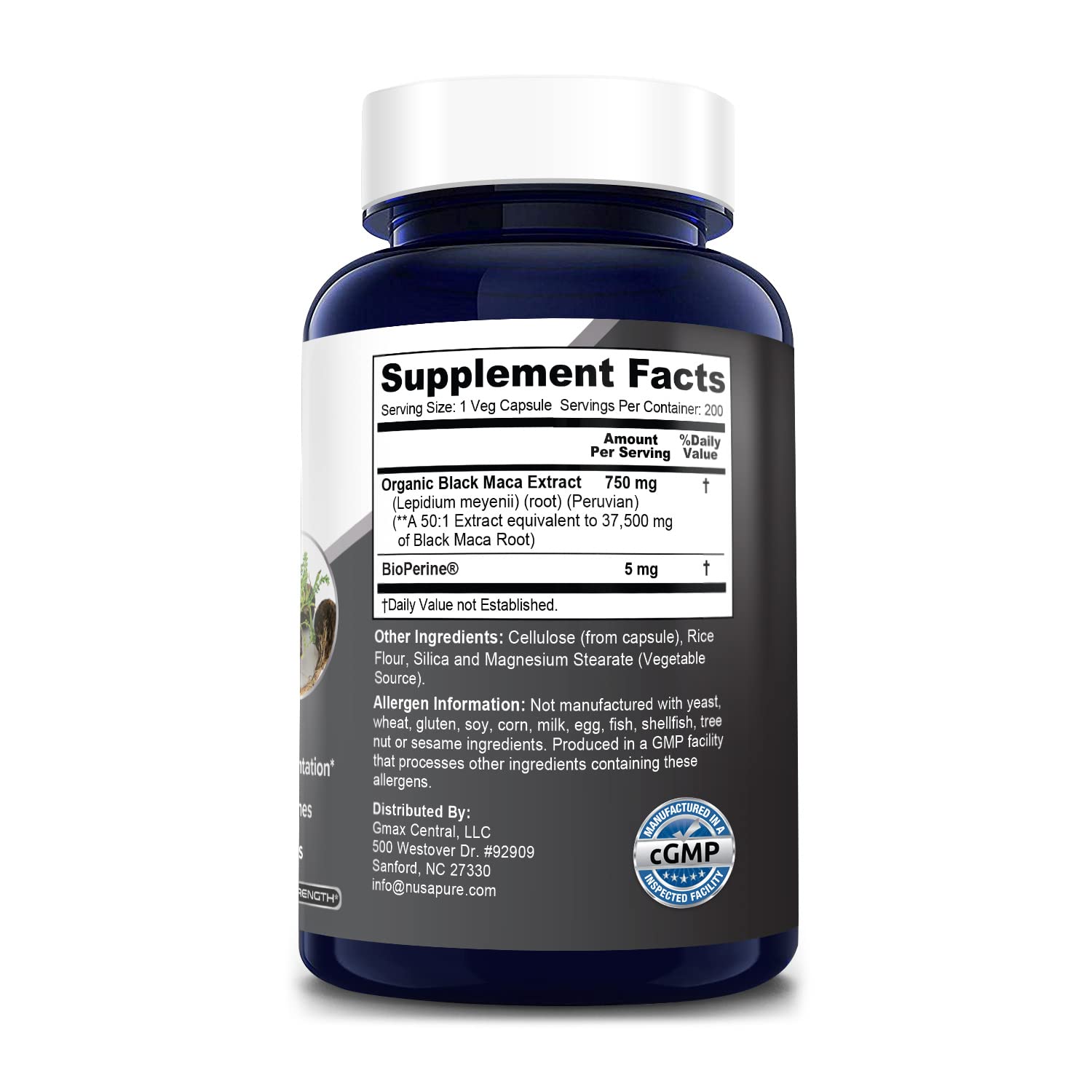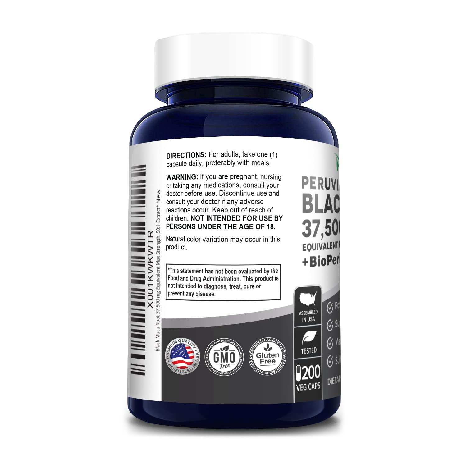 - Peruvian Black Maca 37,500mg equivalent per vegetarian caps. 200 veggie capsules for a full 200-day supply.