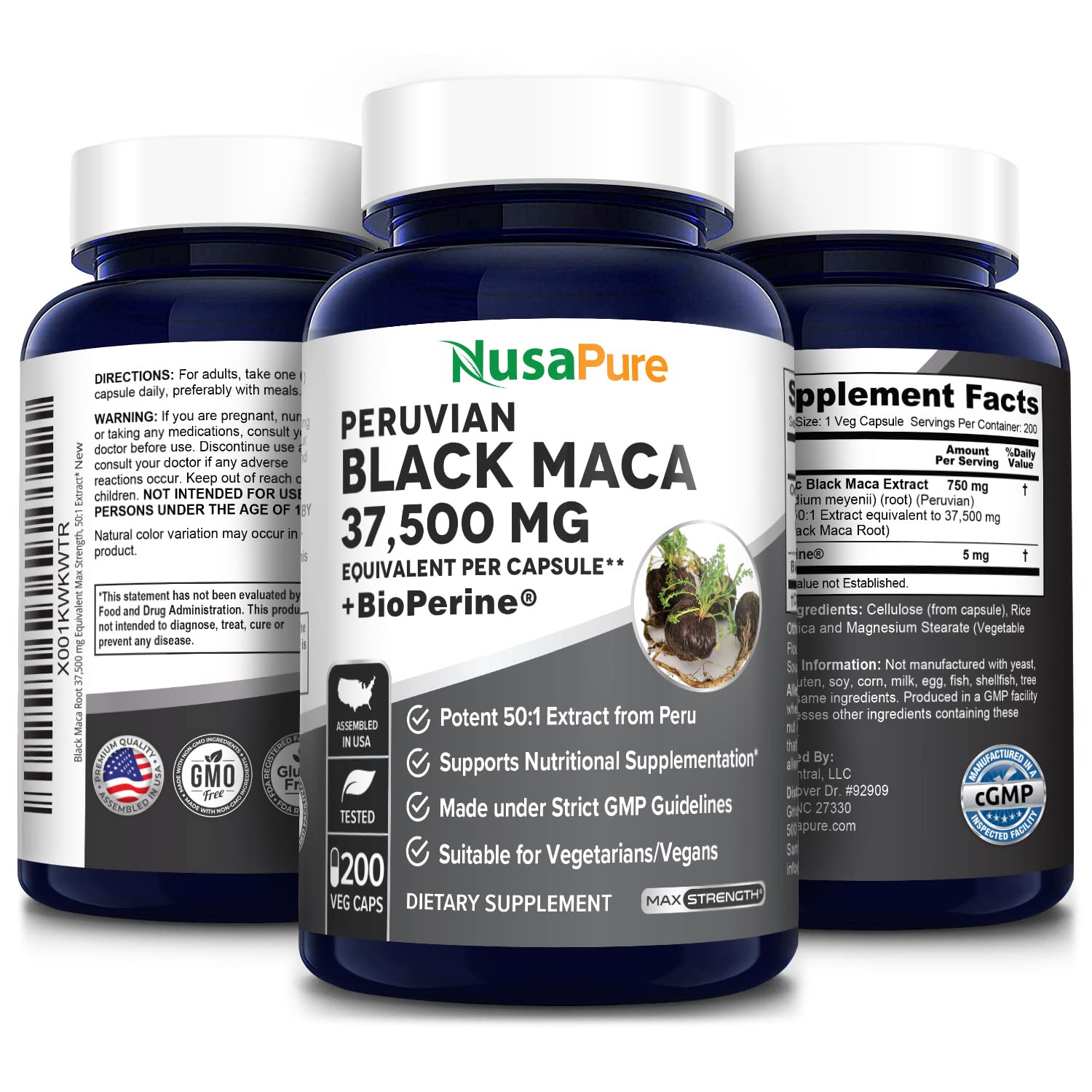 - A 50:1 extract equivalent to 37,500mg of Black Maca Root.With Bioperine