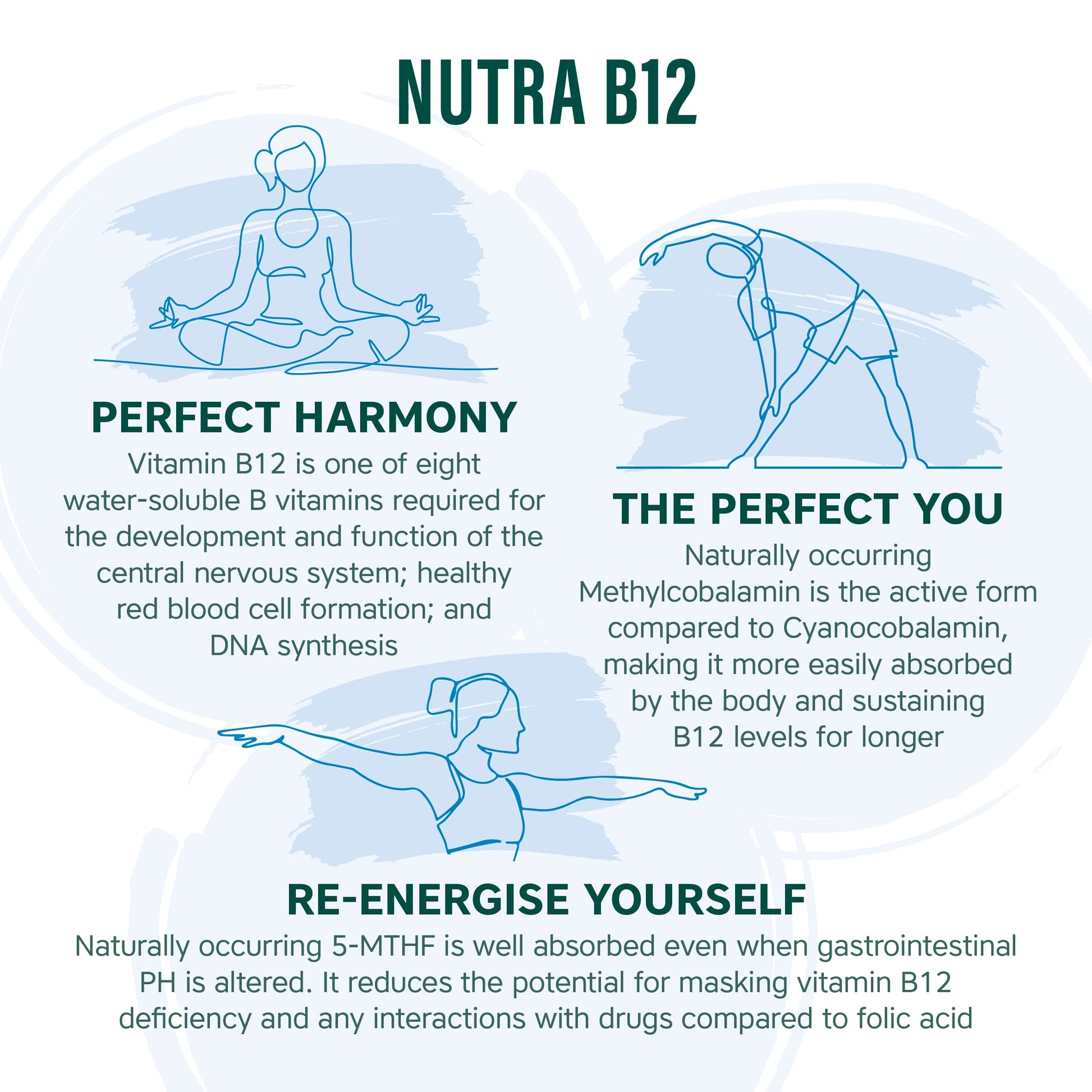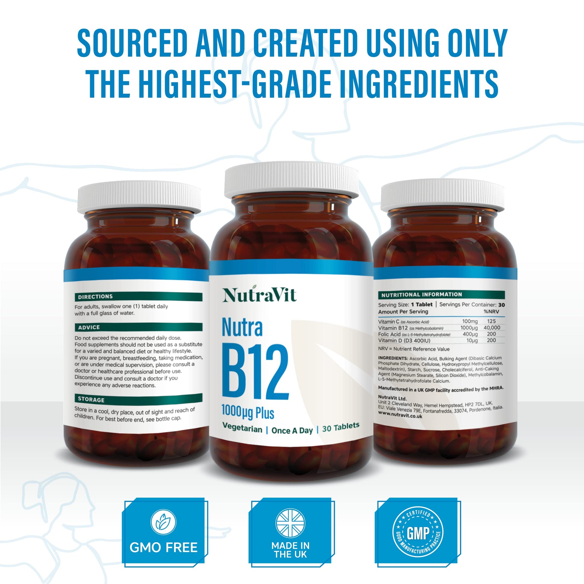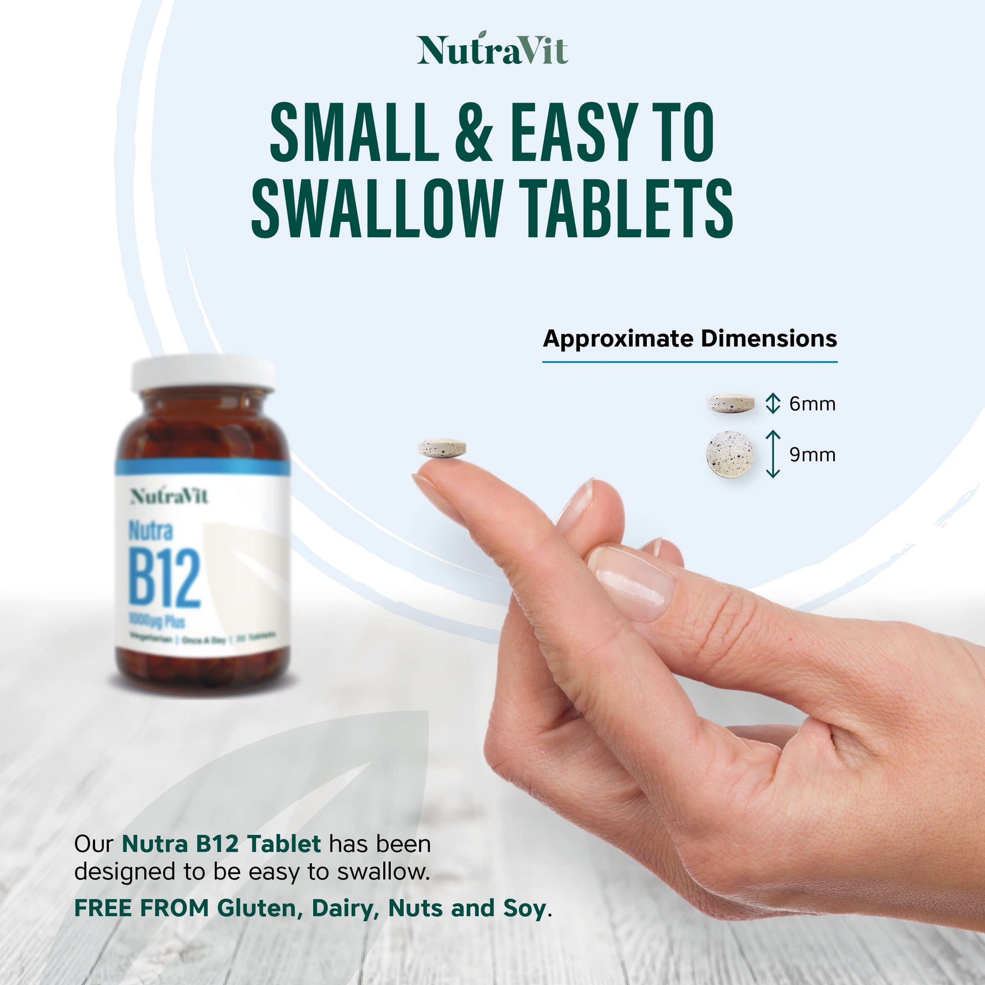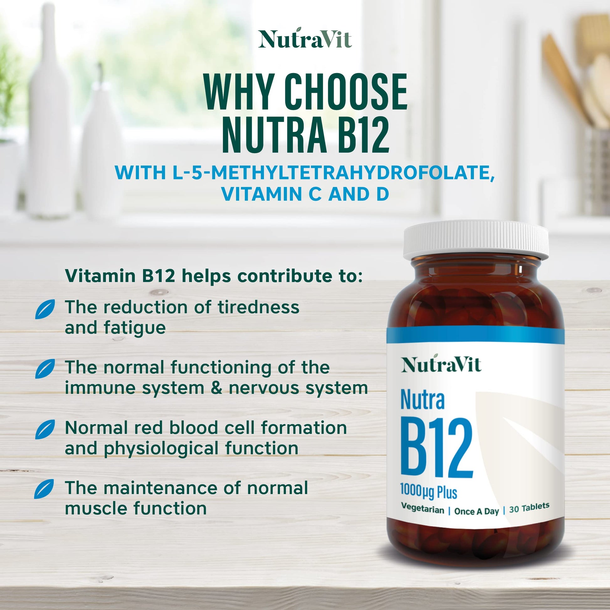 NUTRA B12 Plus - 1000mcg Vitamin B12 Tablets (Methylcobalamin) - 30 Tablets - High Strength Methylcobalamin Vitamin for Tiredness & Fatigue - Vitamin C, D, Folate - Vegetarian - NutraVit