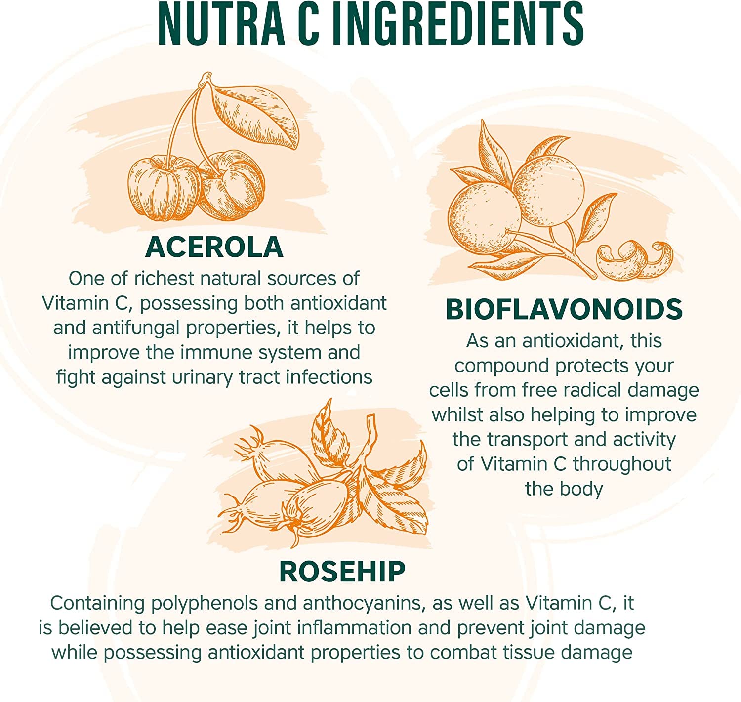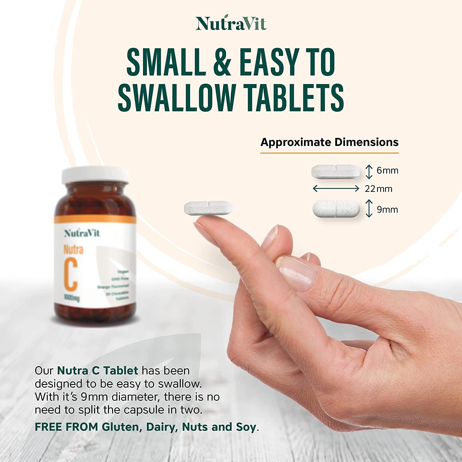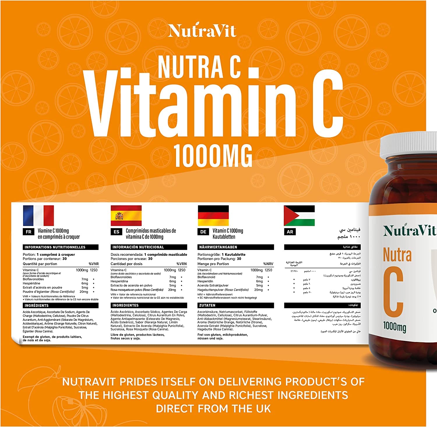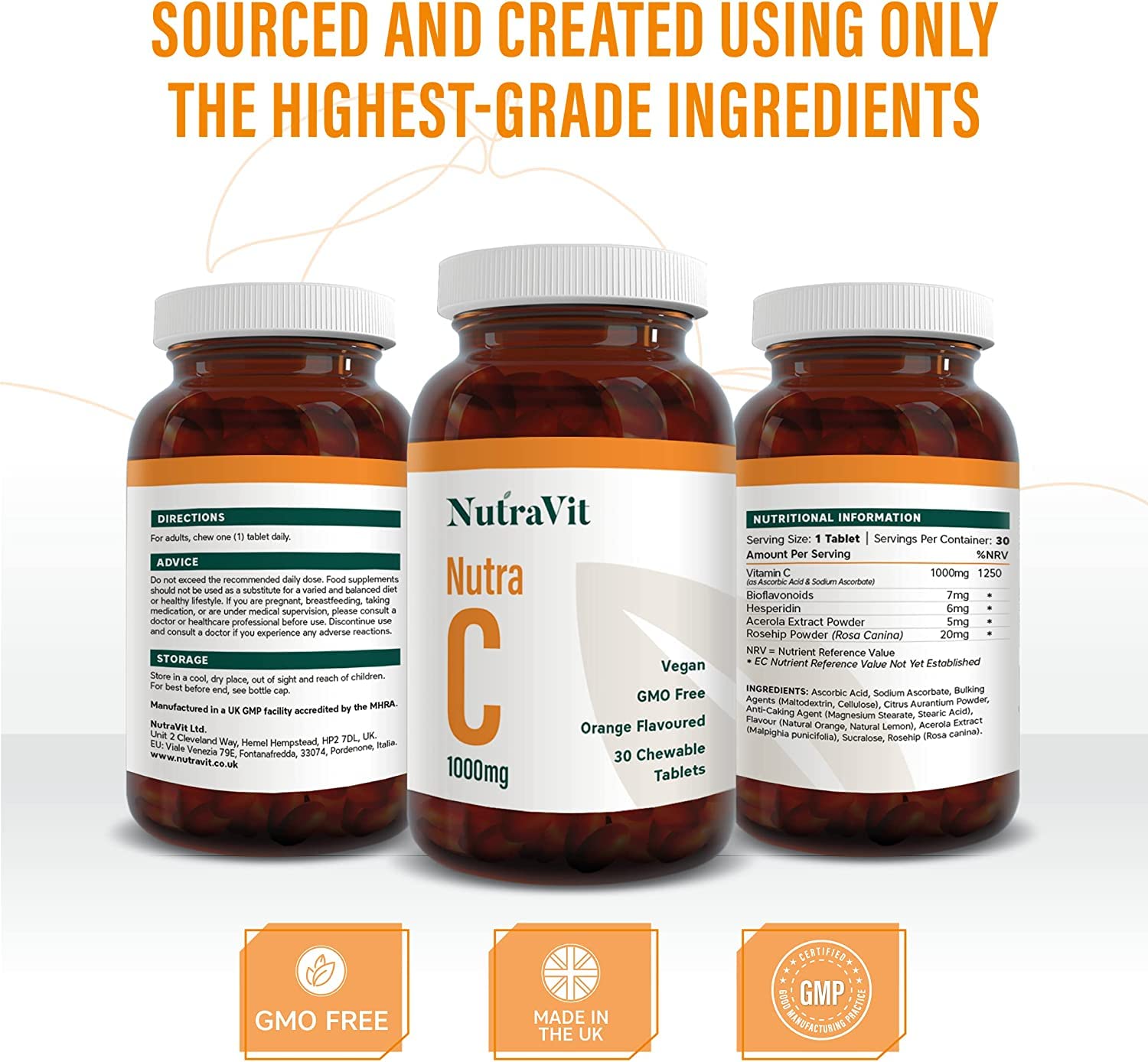 NUTRA C - Vitamin C 1000mg - 30 Chewable Tablets - High Strength Vegan Tablets - Gluten Free | Orange Flavoured - with Rosehip, Hesperidin & Acerola - Manufactured in a UK MHRA GMP Facility - NUTRAVIT