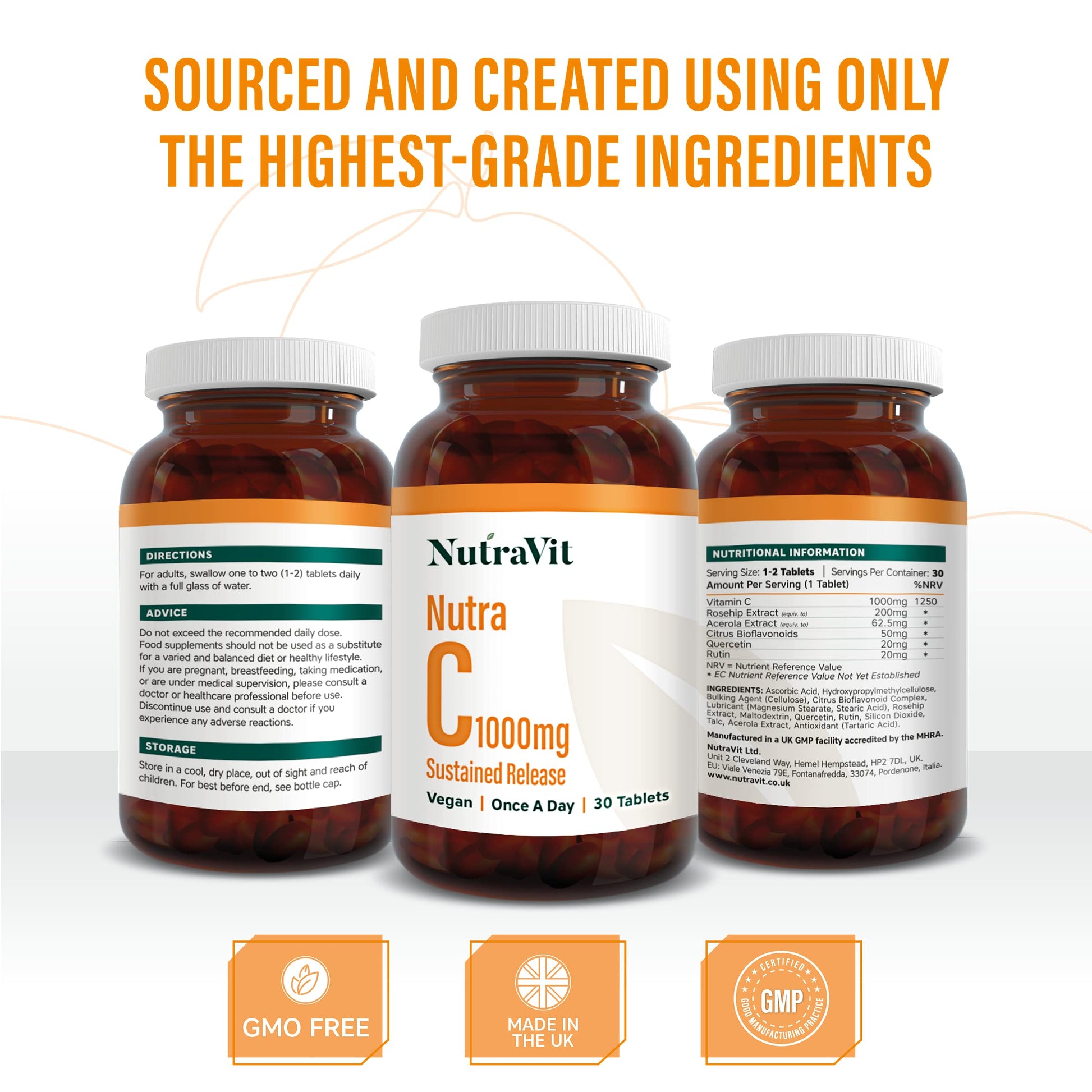 NUTRA C - Vitamin C 1000mg - 30 Tablets - Sustained Release Vegan Tablets - Gluten Free | Orange Flavoured - with Rosehip, Hesperidin & Acerola - Manufactured in a UK MHRA GMP Facility - NUTRAVIT