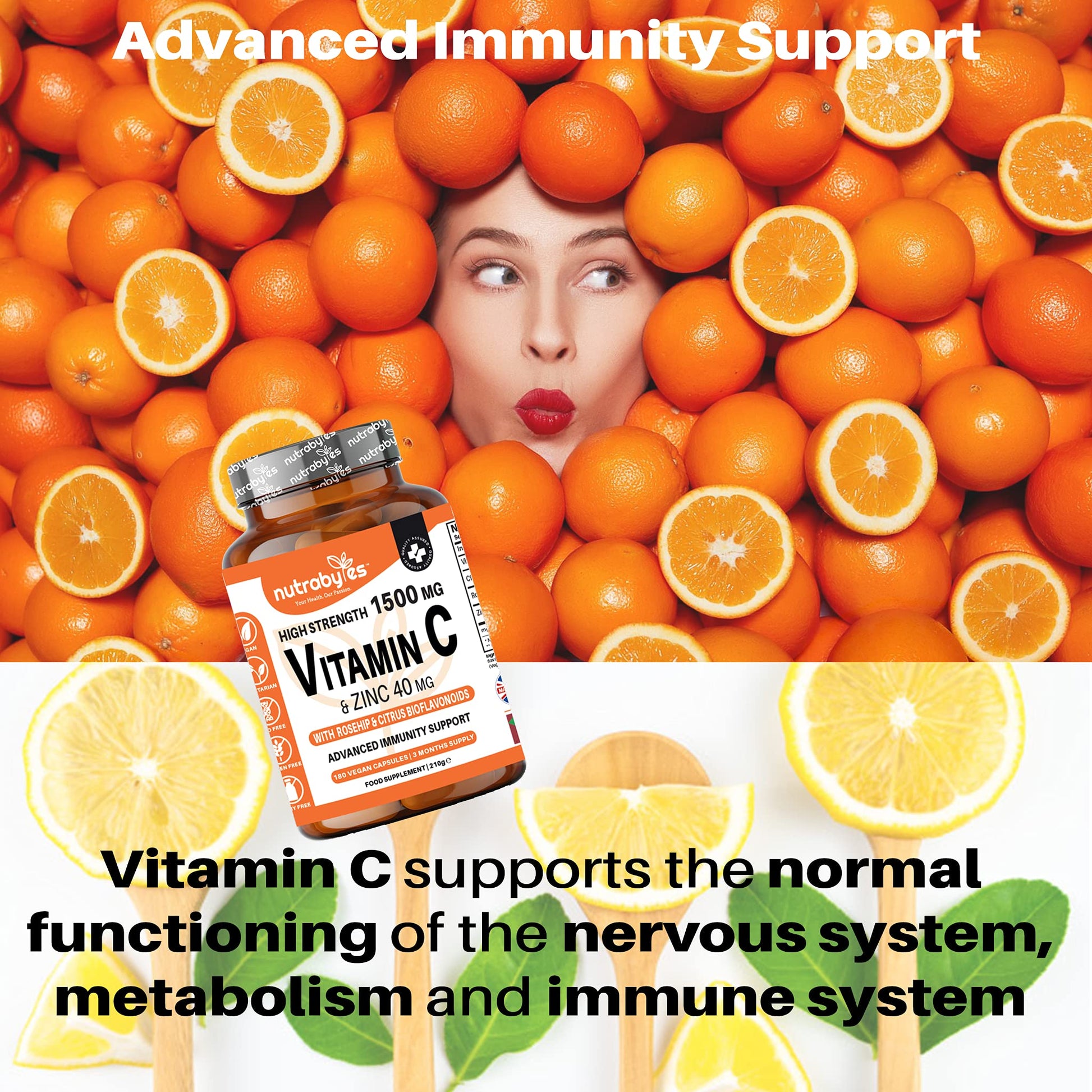 NUTRABYTES High Strength Vitamin C and Zinc Capsules | Vitamin C 1500mg and Zinc 40mg | Enhanced with Rosehip and Citrus Bioflavonoids | for Maintenance of Normal Immune System | 180 Vegan Capsules | Made in UK